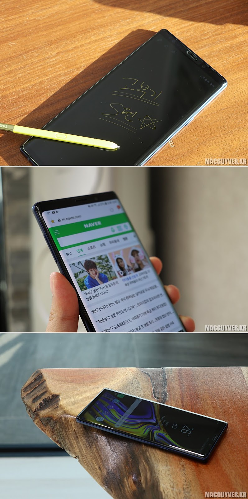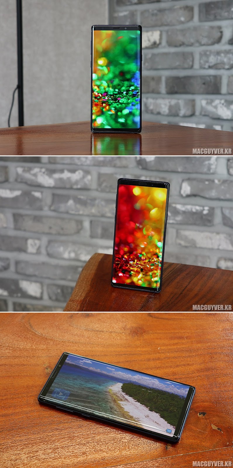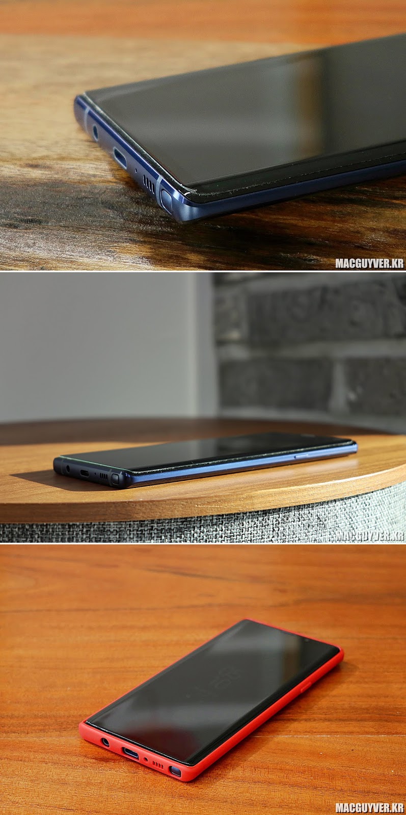 그리고 자체적인 손맛도 뛰어난데요. 올레포빅 코팅 덕분인지 매끄럽게 지문도 잘 묻지 않는 편이고 정말 부들부들합니다. 아쉬움이라면, 너무 매끄러워서 그런지 뒤집어서 내려놓으면 갤럭시노트9이 이리저리 움직일 수 있다는 점입니다. 주의할 필요가 있겠네요.