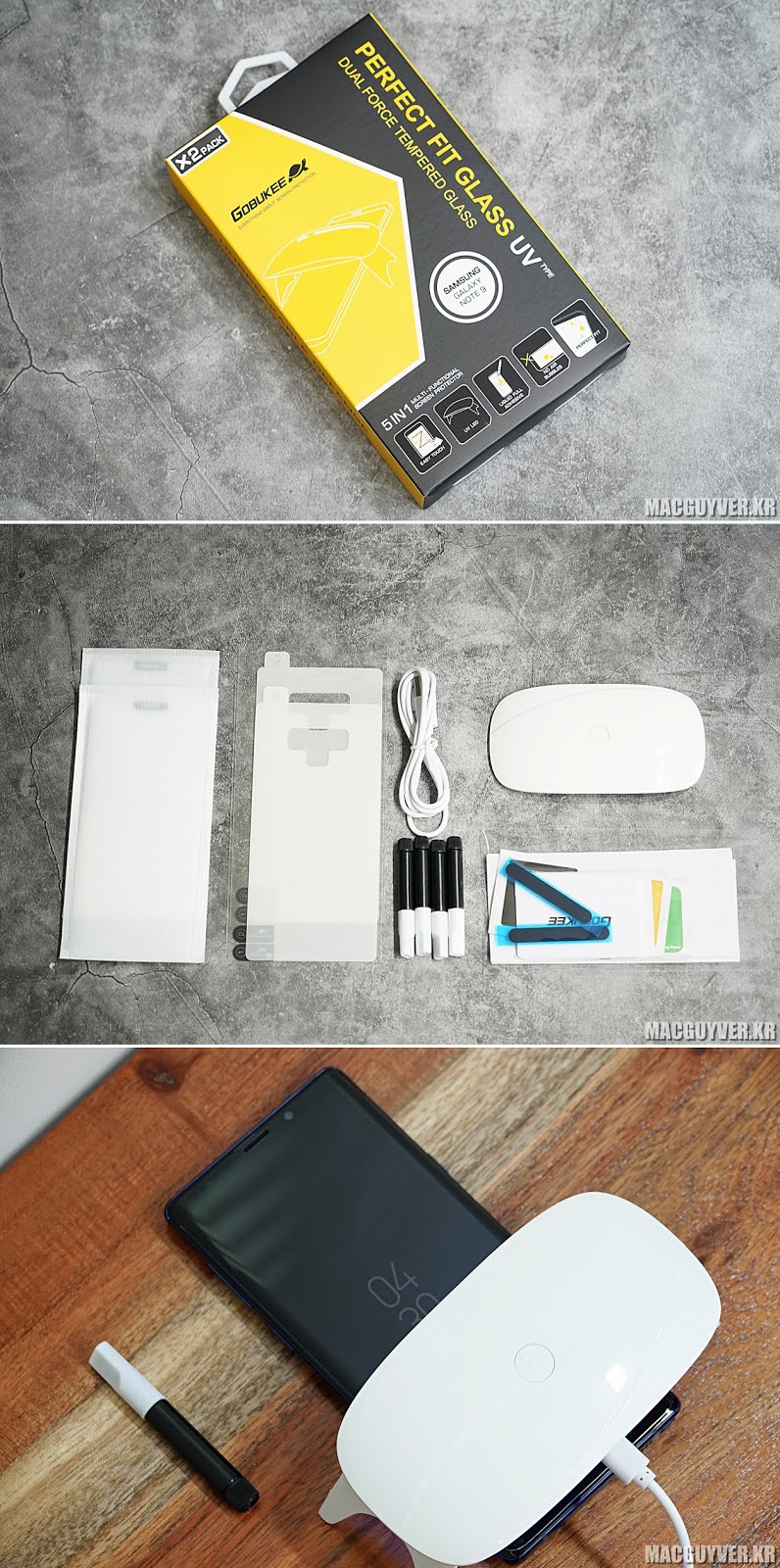 ✎ UV 경화기 등 여러 구성품들로 구성되어 있는 고부기 갤럭시노트9 풀점착 강화유리