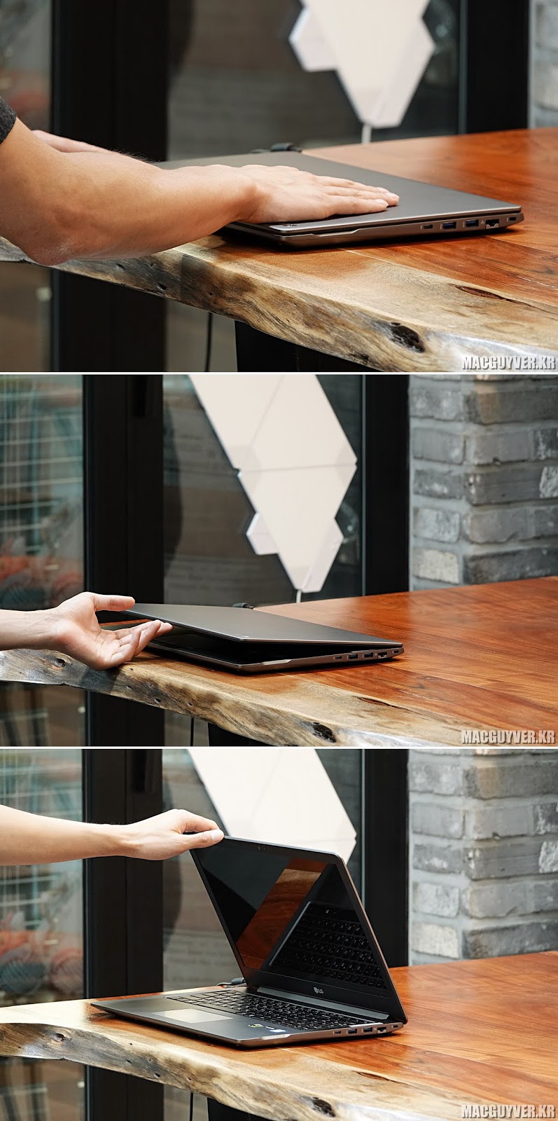 디자인의 경우는 상판을 한 손으로 들어 올릴 수 있어서 편리한 사용이 가능했고, 메탈 느낌의 시크함 및 키보드의 퓨처 화이트 백라이트는 고급스러움을 더해주는 요소가 되기도 했습니다.
