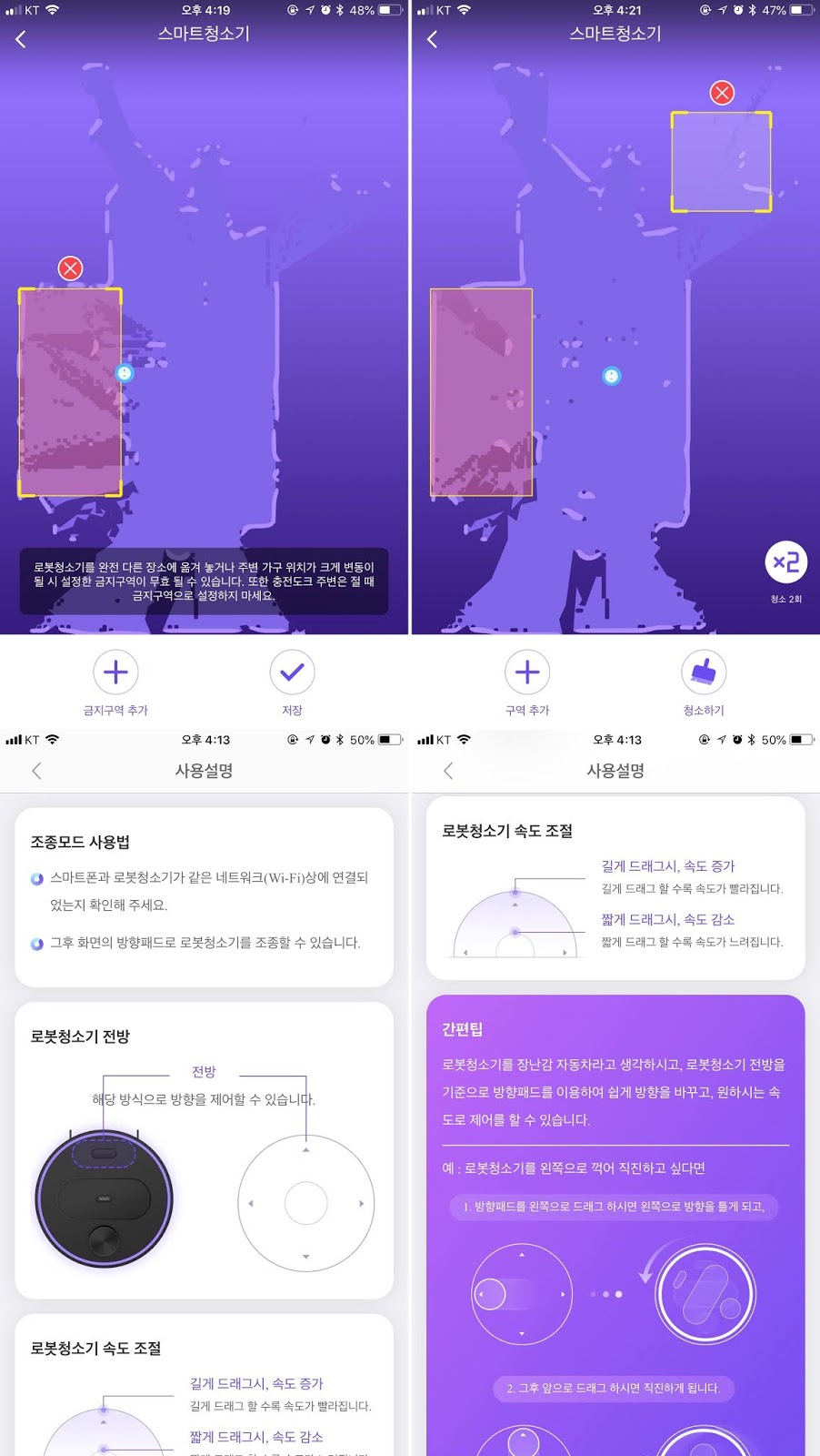 ✎ 청소 금지 구역, 지정 구역 설정을 지정할 수 있었고, 사용이 익숙치 않은 사용자들을 위한 사용 설명도 상세히 나와 있는 앱