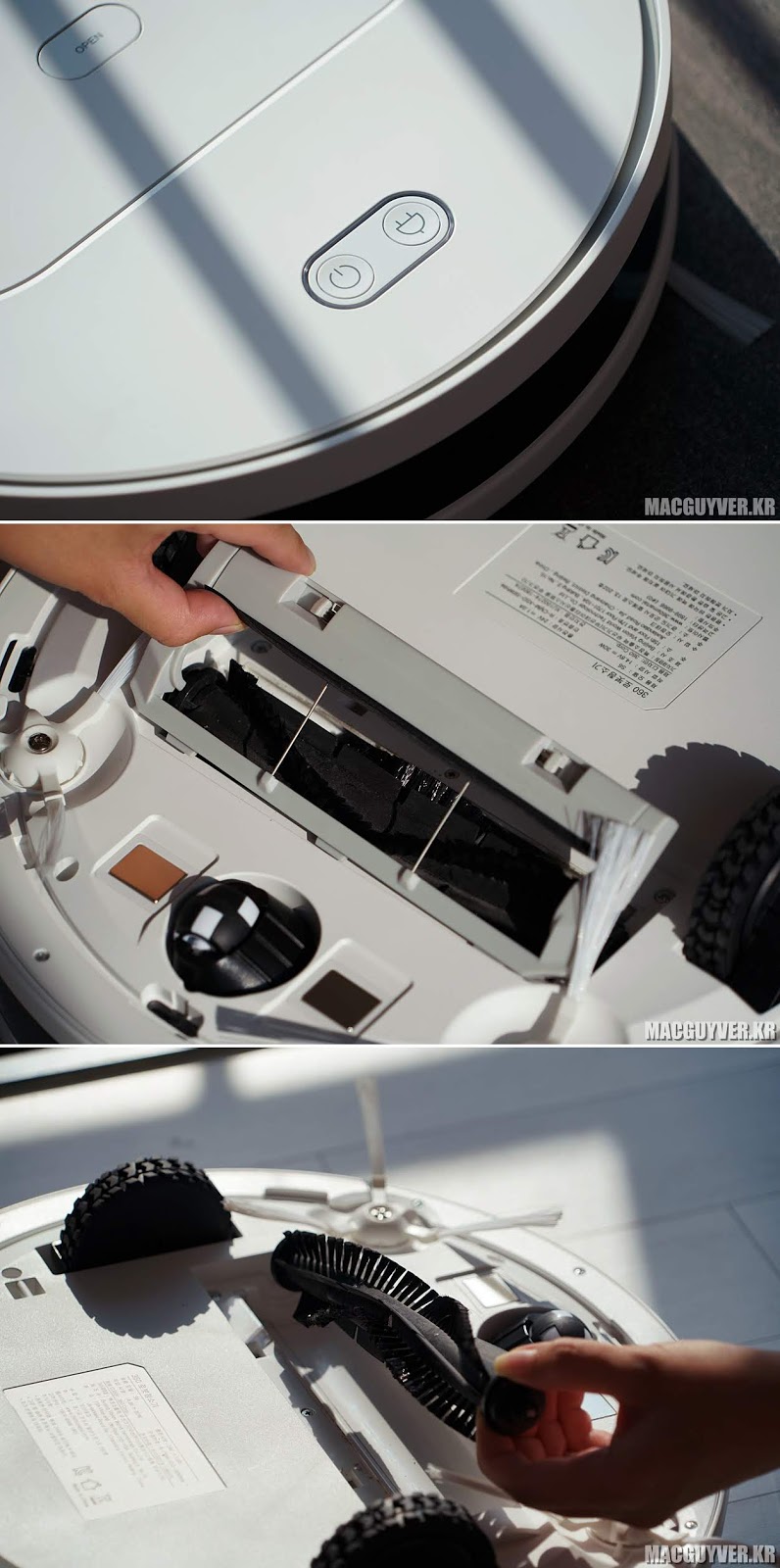 또한 먼지함이 한가운데 있어 버튼만 누르면 딸깍하고 열려서 먼지 비우기도 간편한 디자인으로 설계되어 있네요. 전원 버튼과 홈버튼도 먼지함 바로 아래 자리잡고 있습니다.