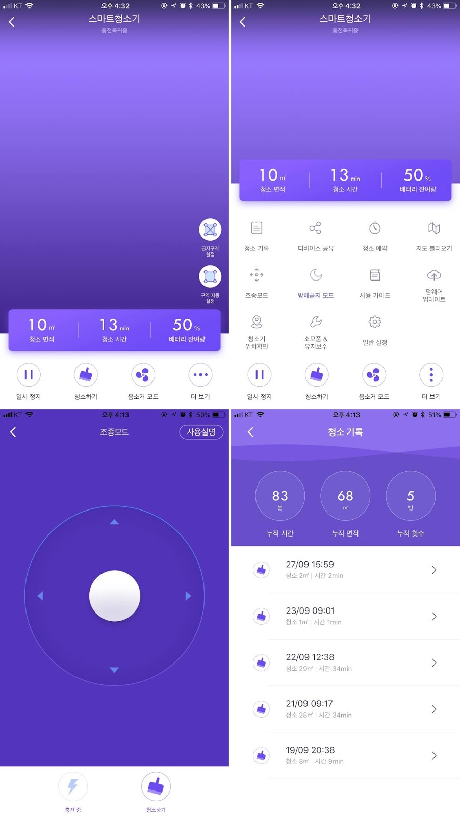 청소 누적 시간, 면적, 횟수 등을 앱으로 확인할 수 있어서 편리했고, 음량 조절, 디바이스 조명을 켜고 끄는 등의 세세한 설정까지 해 볼 수 있어서 사용자 입장을 많이 고려했다는 점을 느낄 수 있었던 것 같습니다.