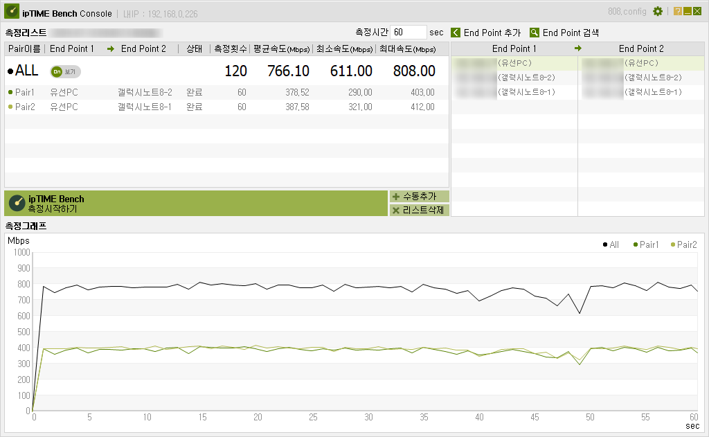 유선 PC 등 2대 이상의 기기와 함께 측정할 경우 실효 속도가 800Mbps 이상으로 측정된다고 하는데요. 다른 아이피타임 공유기들은 물론이고, 일반적으로 실효 속도가 600Mbps를 넘지 못하는 경우가 많은데, 비교적 고사양 제품이라 더 빠른 실사용 속도를 제공할 수 있는 것 같습니다.