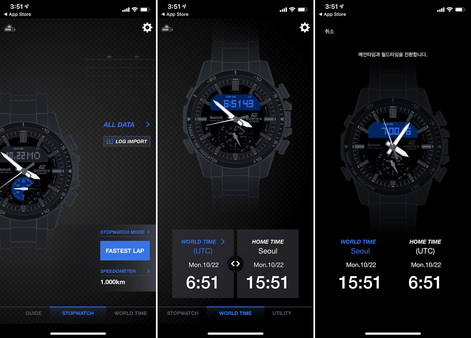 에디피스 ECB-800 역시 스마트폰과 연동이 가능한데, 자동 시각 수정을 비롯해서 홈 타임과 월드타임 기능, 300개 도시 시간 표시 등의 부족함 없는 기능성까지 모두 더했다.