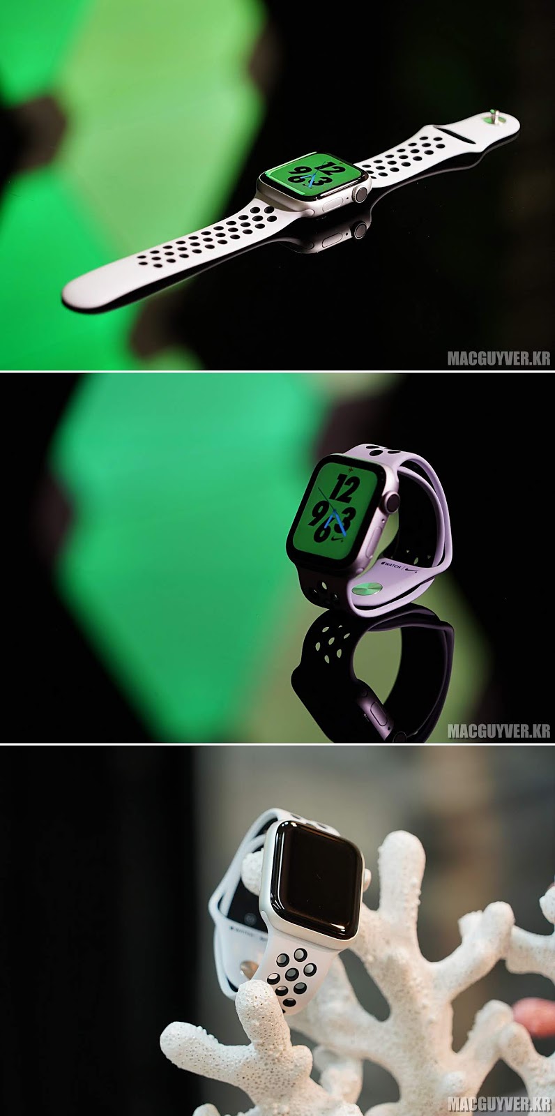 - 심전도를 위한 디지털 크라운은 실버 컬러의 나이키+에서 눈에 띕니다. 그러니까, 측면 실버 컬러가 톤이 달라요.