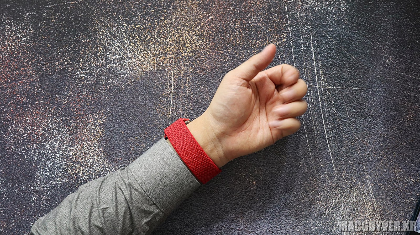 스포츠 밴드와 다르게 조금 더 짙은 느낌이고, 다양한 레드 컬러가 오묘하게 섞인 느낌이라 만족스러웠습니다. 물론, 물이 묻으면 털어낼 수는 있는데 완전히 말리기까지는 시간이 제법 걸리는 편이네요.