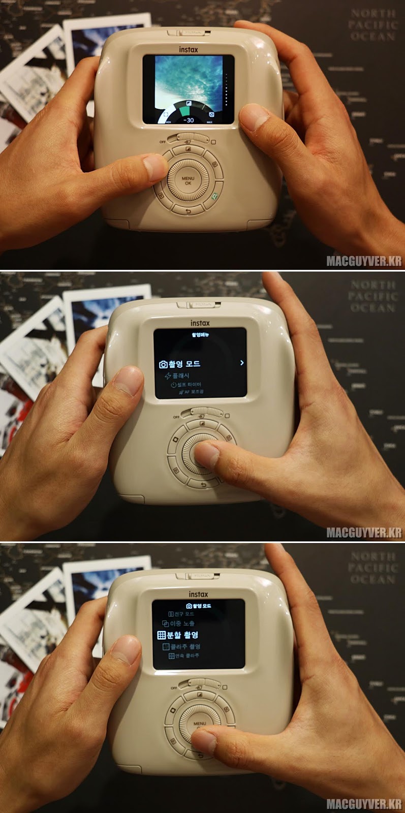 카메라 모드에서 가운데 메뉴 버튼을 눌러서 촬영 모드를 변경할 수 있는데요. 인스탁스 스퀘어 SQ20를 계속 사용하고 싶게 만드는 재미있는 기능들이 많습니다.