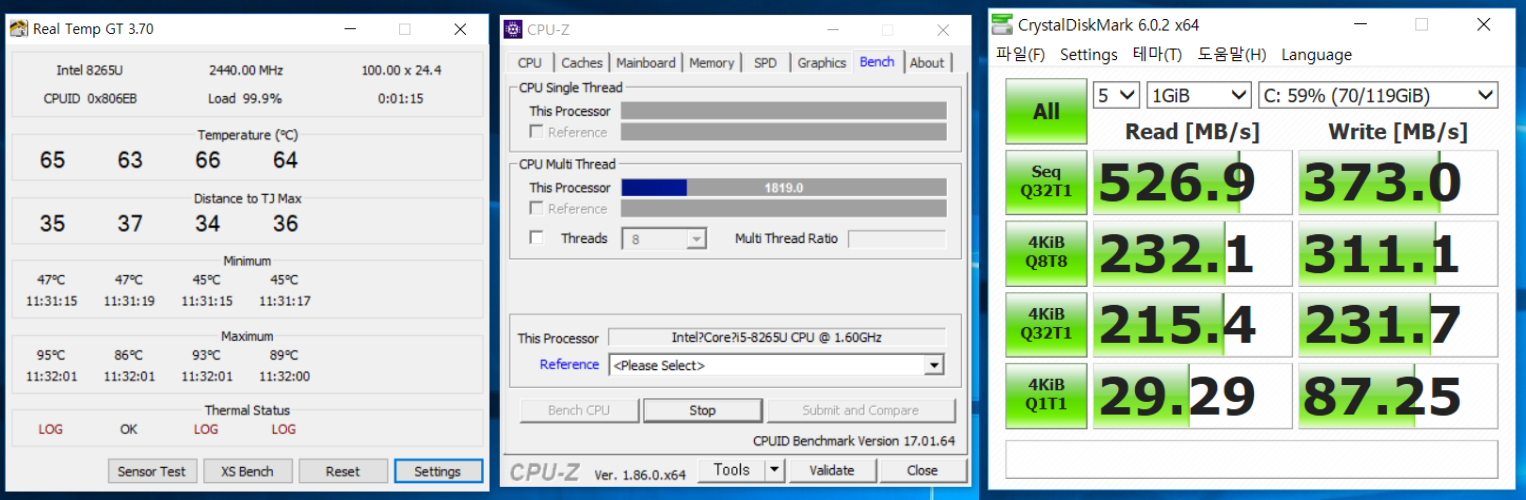 대신 발열은 안정적이었습니다. PCMARK 2번, CPU-Z 스트레스 테스트 1번을 거친 후에 만져봐도 딱히 뜨겁지 않고, CPU 온도도 60도대로 낮은 수준이었습니다.