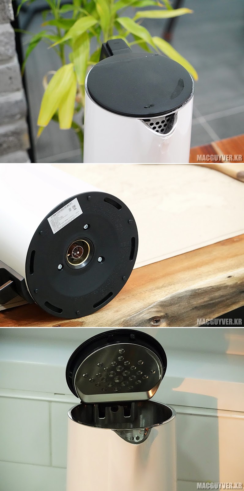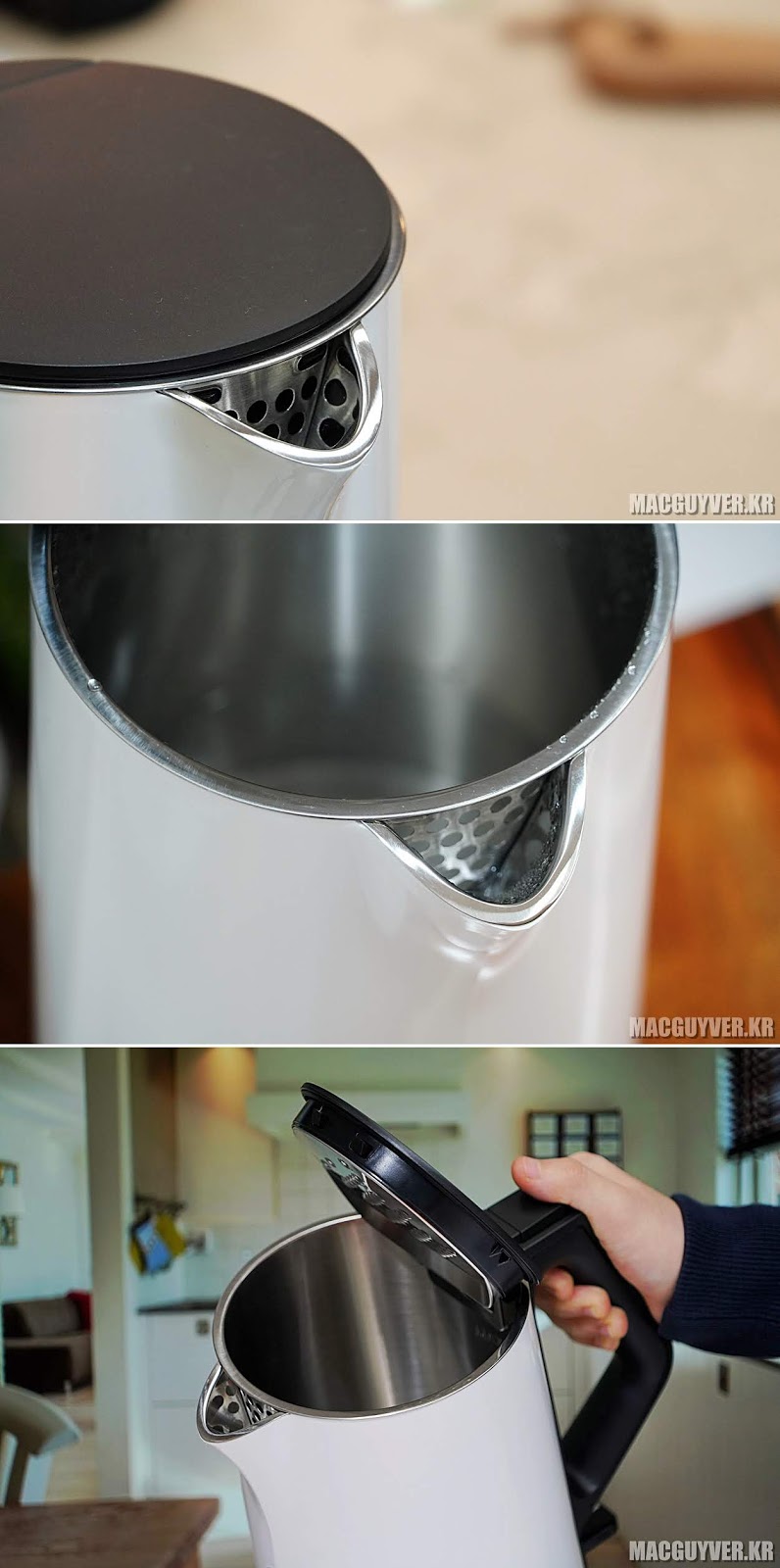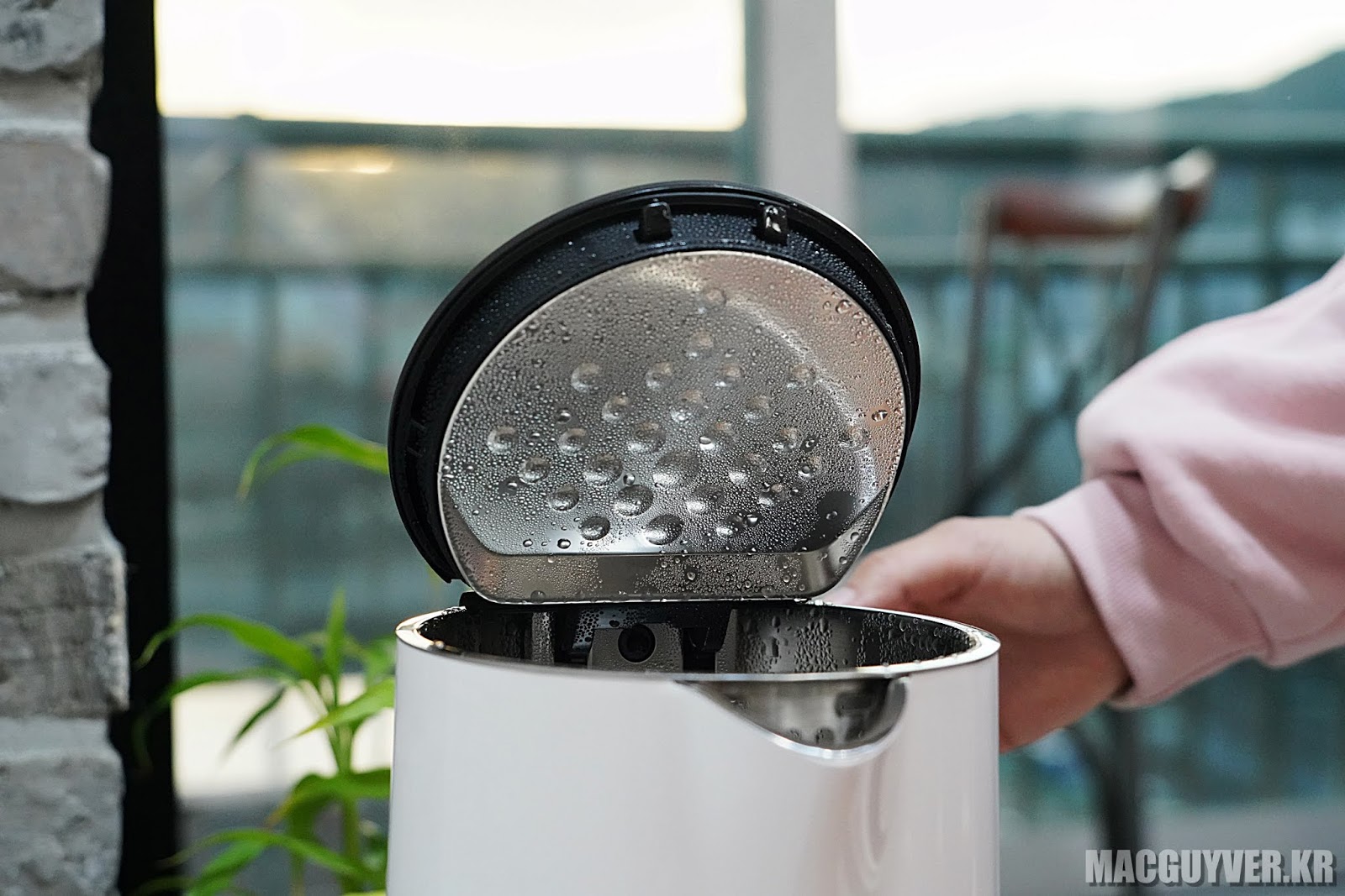 그래서 물이 다 끓고 난 뒤 뚜껑을 열었을 때 전기포트 밖으로 뜨거운 물이 흐르는 것을 방지해 더욱 안전한 사용이 가능하죠.