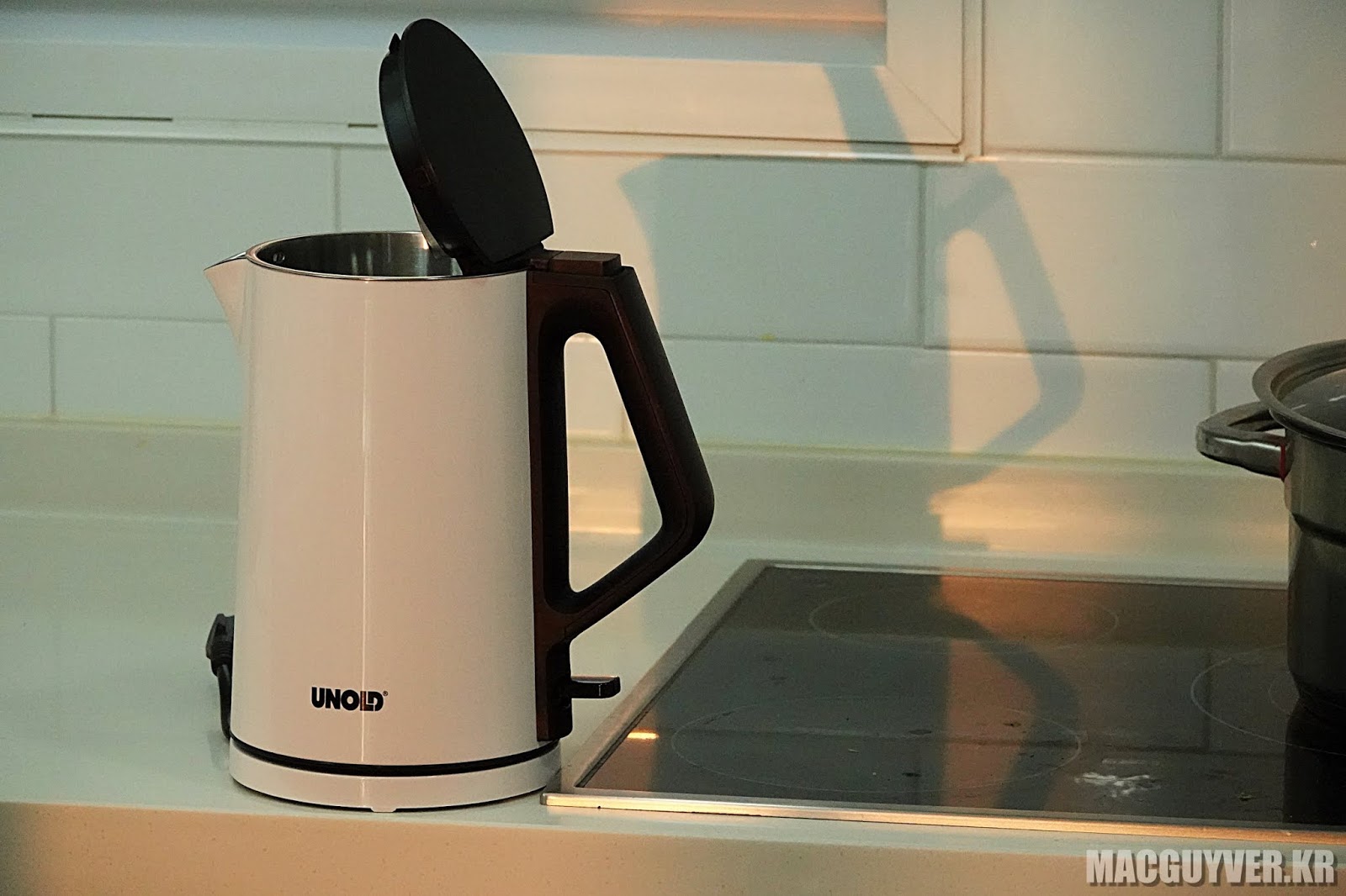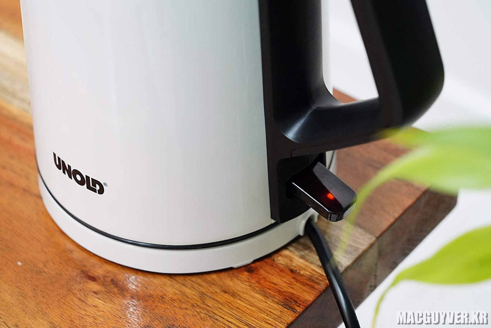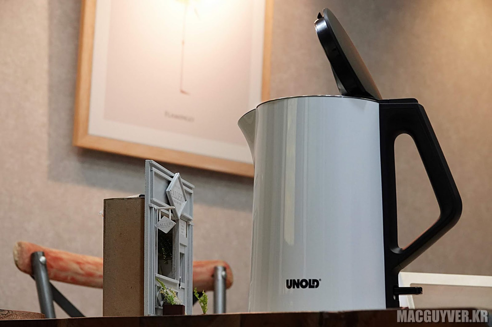 스테인레스 스틸 재질로 되어 있어서 위생적으로 사용할 수 있는데요. 보통의 전기포트가 뚜껑 부분이 플라스틱 재질로 되어 있는 반면 우놀드 전기포트는 안쪽 뚜껑 부분이 스테인레스 스틸 재질로 되어 있습니다.