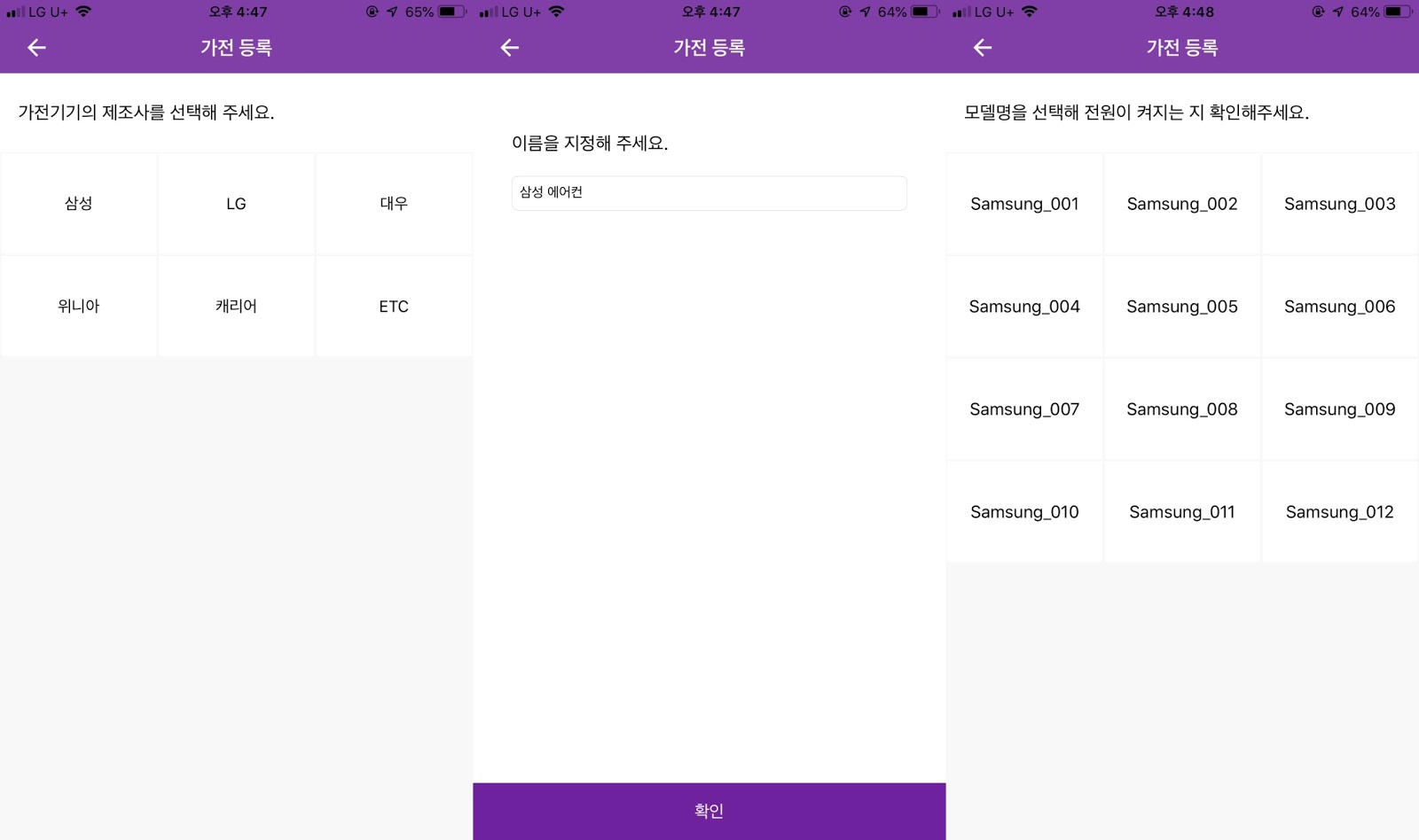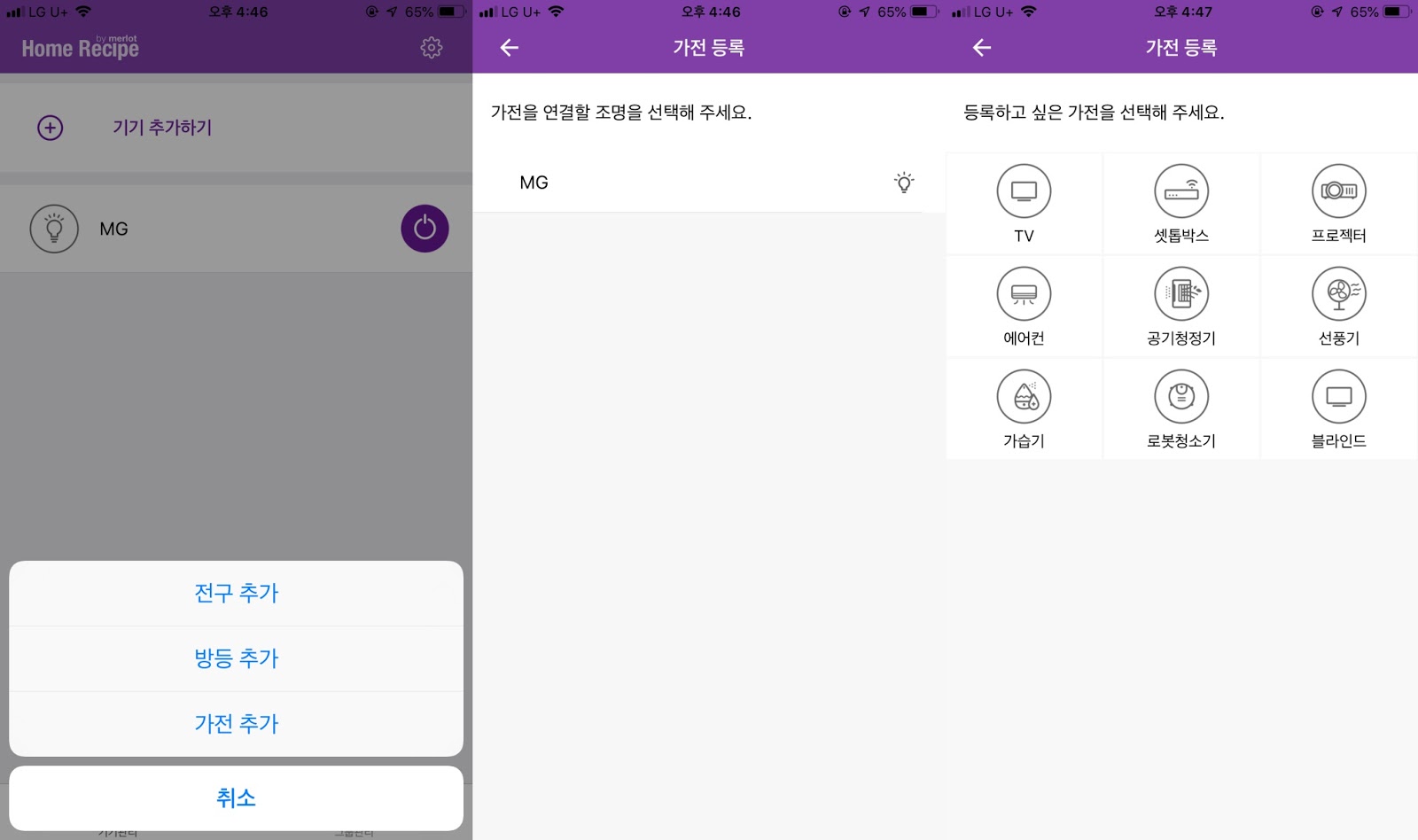 조명 선택 -> 가전 선택 -> 제조사 선택 -> 가전 및 IR 적외선 신호 등록