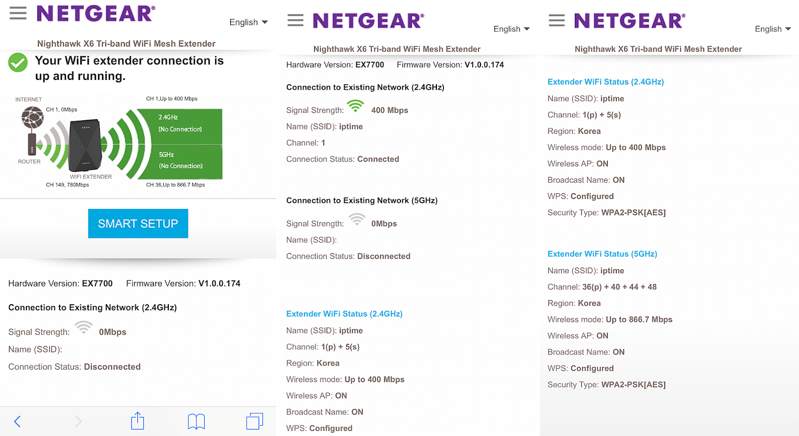 설정 자체는 간단합니다. 네트워크 확인 -> 스마트 설정 -> 5Ghz 활성화 -> 네트워크 신호 선택 -> 비밀번호 확인 -> 완료.