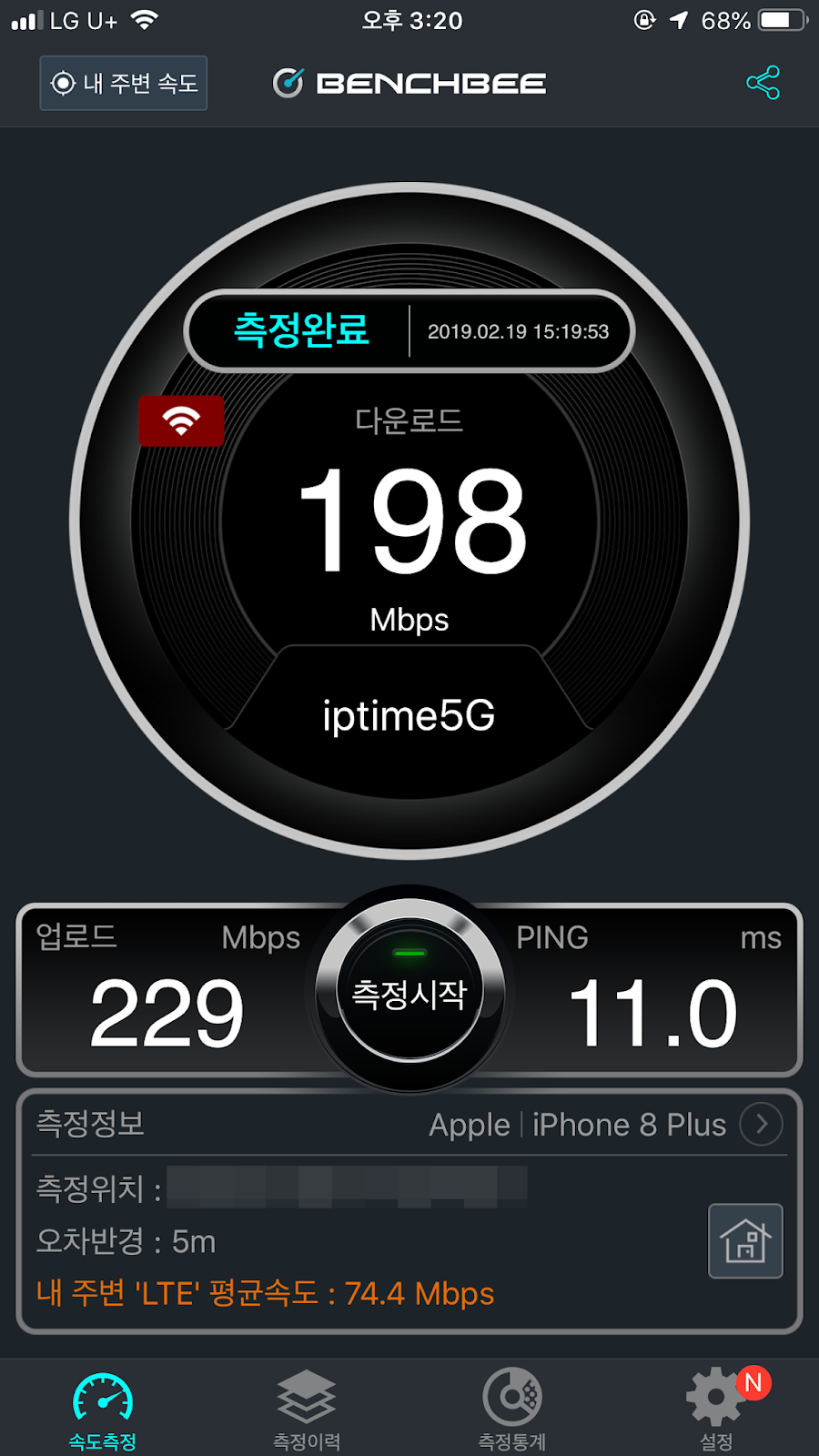 테스트 결과, 다운로드 속도 업로드 속도 모두 200Mbps 이상으로 측정되었습니다. 2.4GHz는 보통 80Mbps 정도로 측정되니까, 5GHz 속도를 그대로 지원한다는 점은 확실하네요.