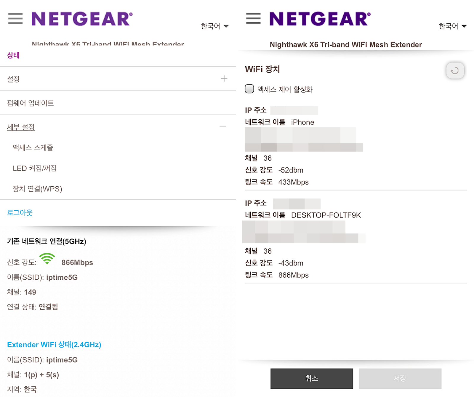 증폭기랑은 연결 안 되겠다 싶었는데, 빨간 불이 뜨긴 했지만 연결되었습니다. 공유기의 연결 범위 안에 넷기어 나이트호크 X6 Mesh 와이파이 증폭기가 완전히 들어가지 않더라도 공유기의 커버리지와 증폭기의 커버리지 사이에 겹치는 부분이 있다면 연결이 되는 것 같네요.