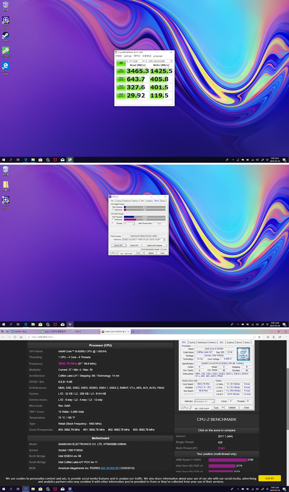 이 2in1 노트북은 CPU로 인텔 i5-8265U 코어를 탑재했는데, CPU-Z 벤치마크 프로그램으로 돌려보니 점수가 생각했던 것보다는 훨씬 괜찮게 나왔습니다.