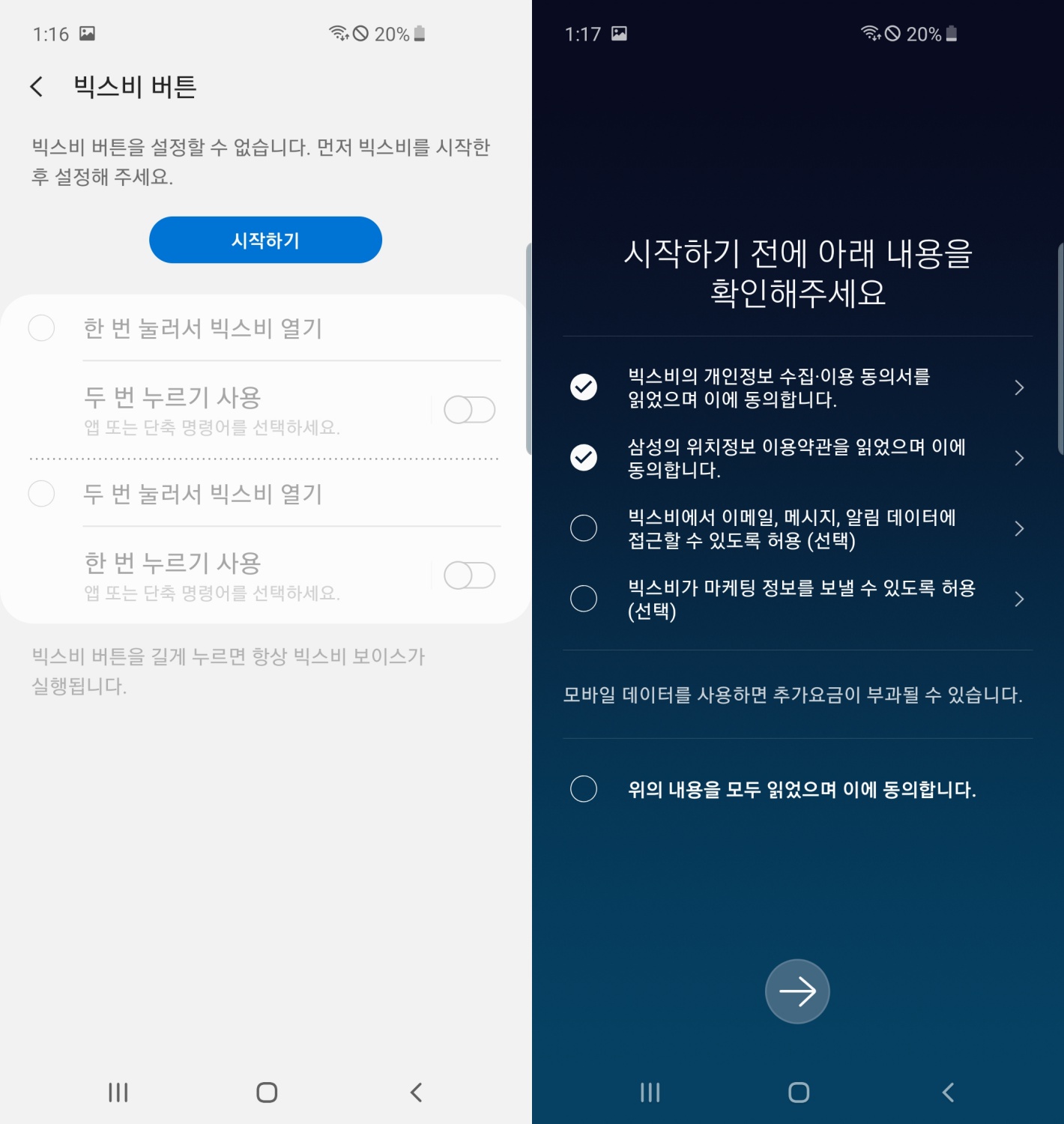 사실 빅스비를 완전히 비활성화할 수는 없어요. 그래도 한 번 누르자마자 나타나는 건 막을 수 있습니다.