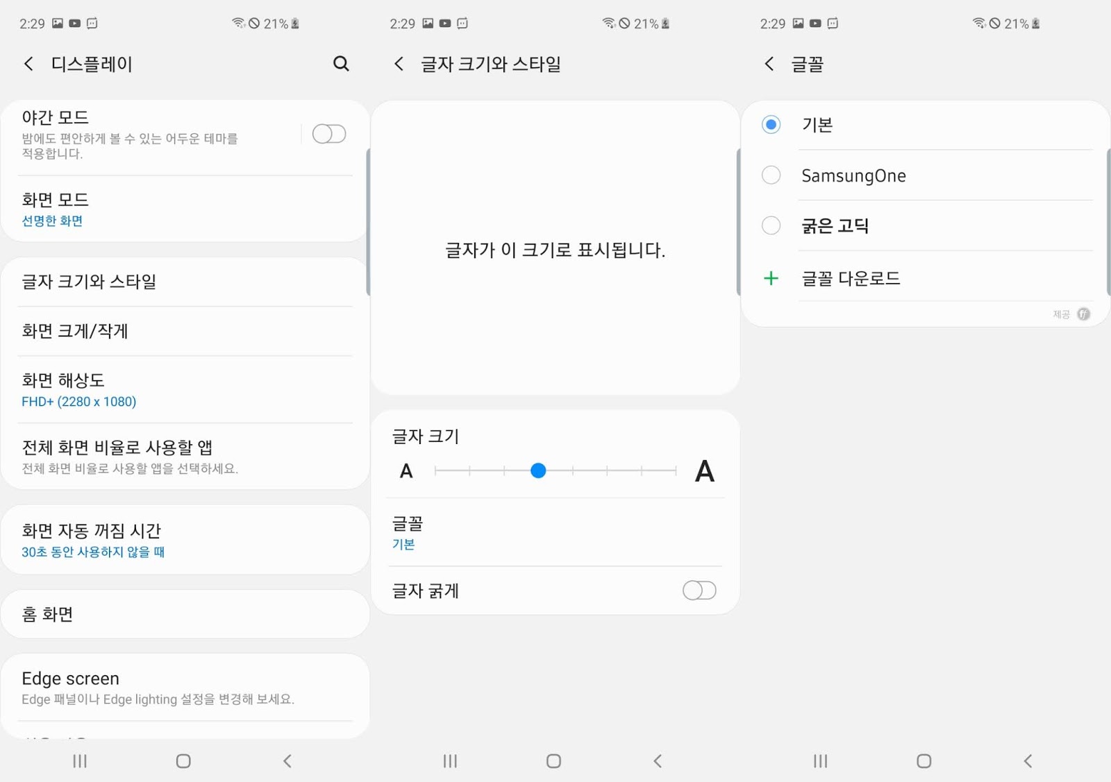 방법 : 설정 - 디스플레이 - 글자 크기와 스타일 - 글자 크기, 글꼴 조절
