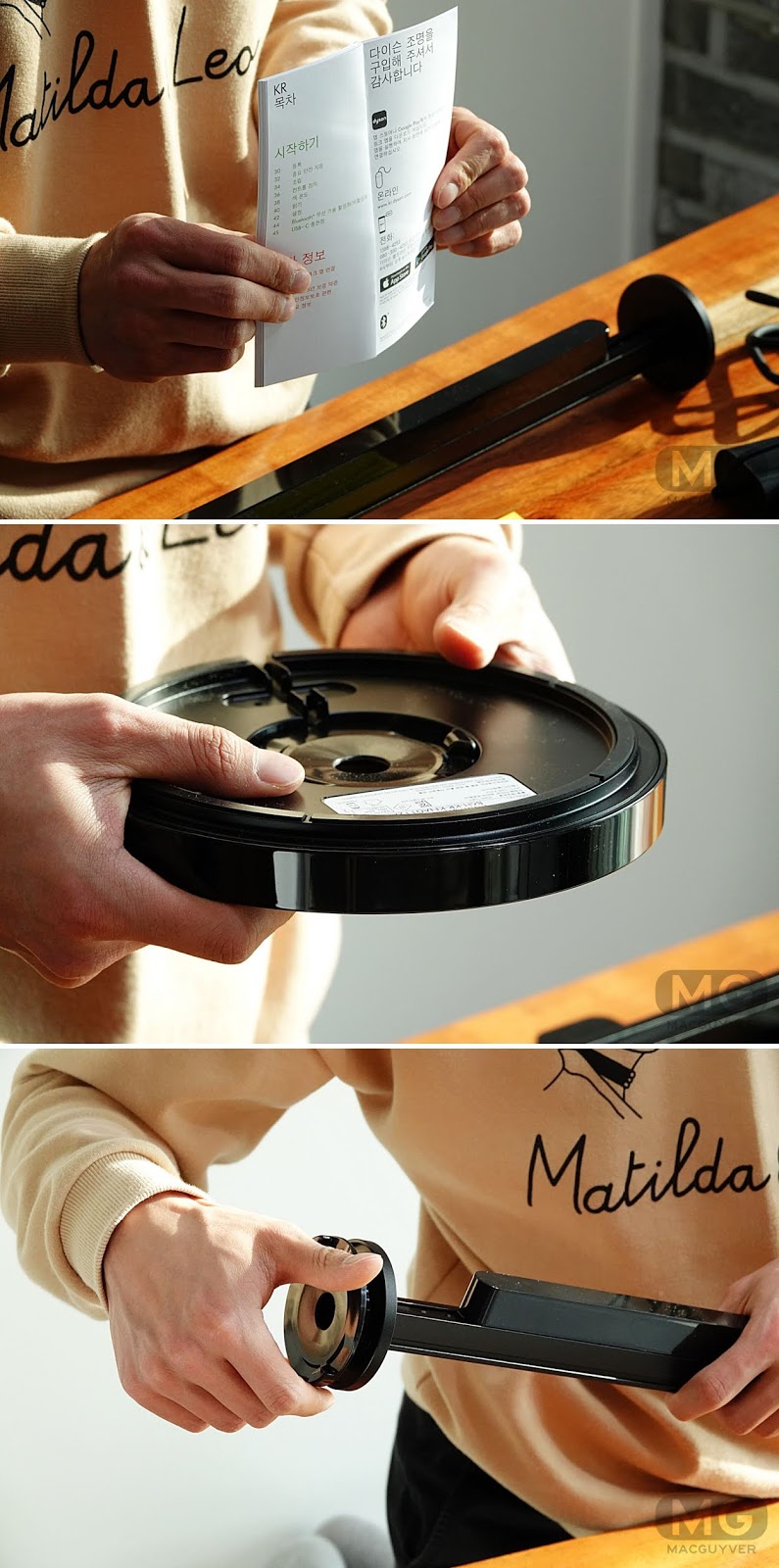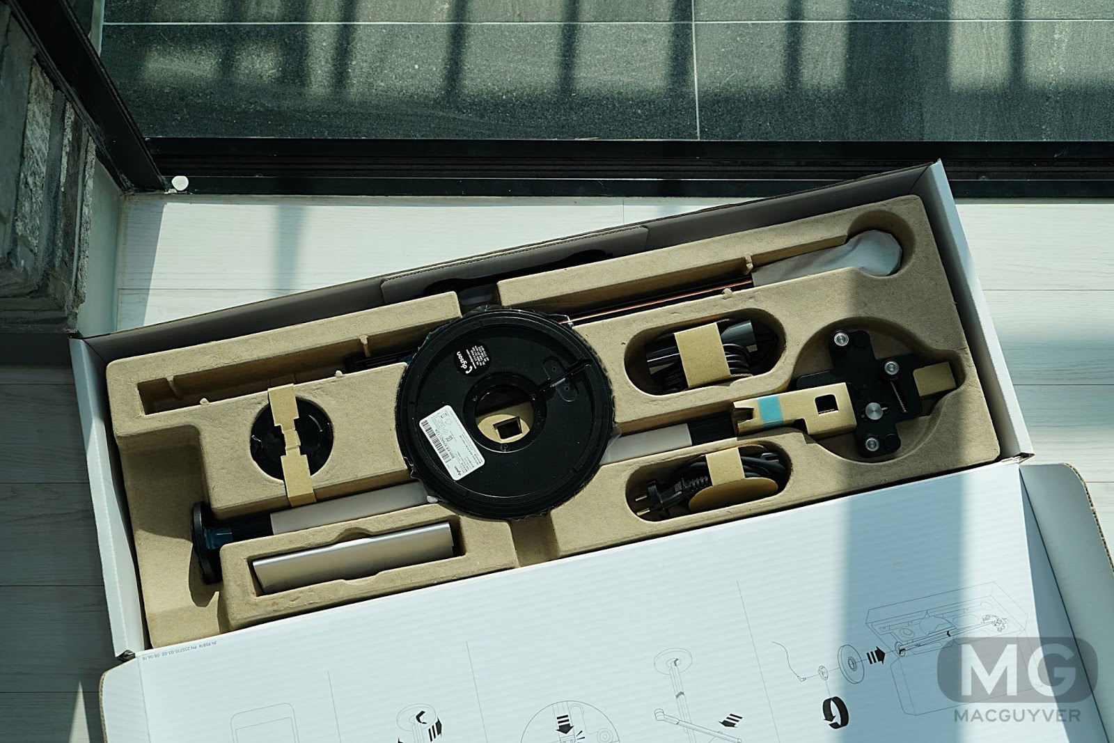조립할 때 특이점은, 드라이버 같은 다른 도구가 필요 없었다는 점인데요. 도구가 딱 하나 필요하긴 합니다. 포장 박스요. 하단 원판과 기둥을 연결할 때는 기둥을 포장 박스에 올려두고 연결하면 편했습니다.