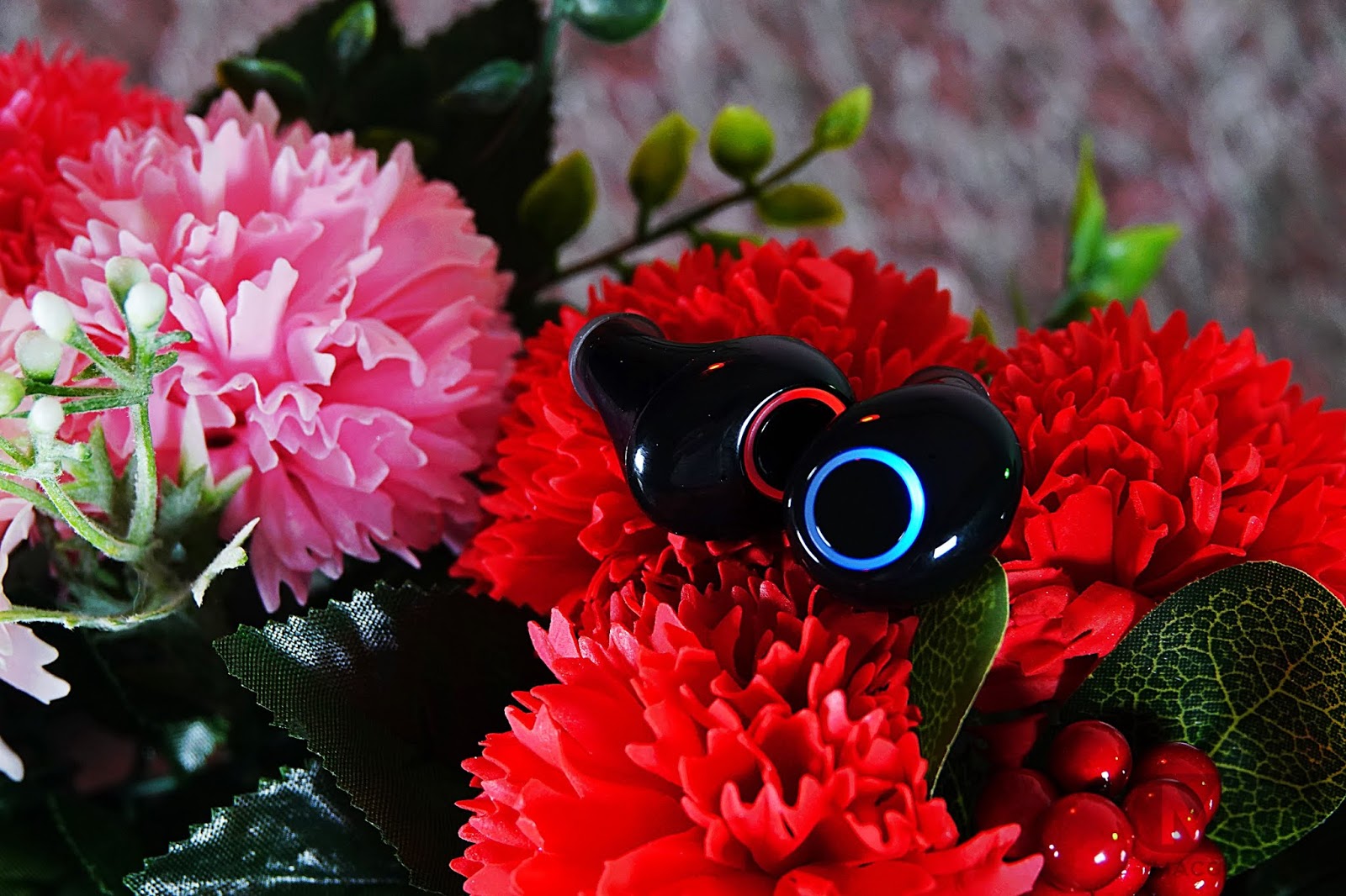 후면 중앙을 보게 되면 충전 단자를 중심으로 3개의 LED가 위치합니다. 중앙에는 크래들 충전 정보가 빨강/파랑 LED로 표기되고, 좌우 LED는 각각의 이어버드에 대한 충전 정보를 보여줍니다.