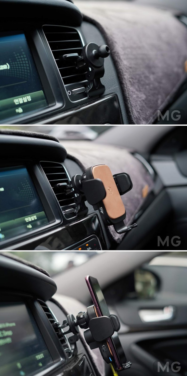 실제로 스마트폰이 닿는 부분이 가죽으로 되어서 폰을 거치할 때는 부드럽게, 평소에는 고급스럽게 보인다는 장점이 있네요.