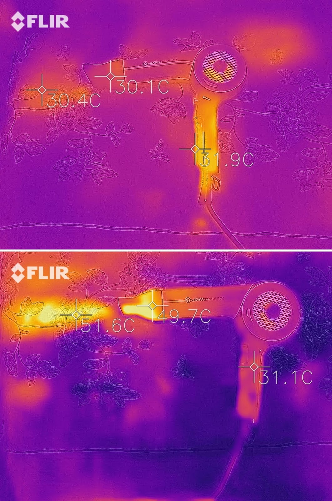 ✎ JMW MA6001A 드라이기를 열화상 카메라로 측정한 사진입니다. 손잡이 부분의 온도가 올라가지 않는 모습을 볼 수 있죠,