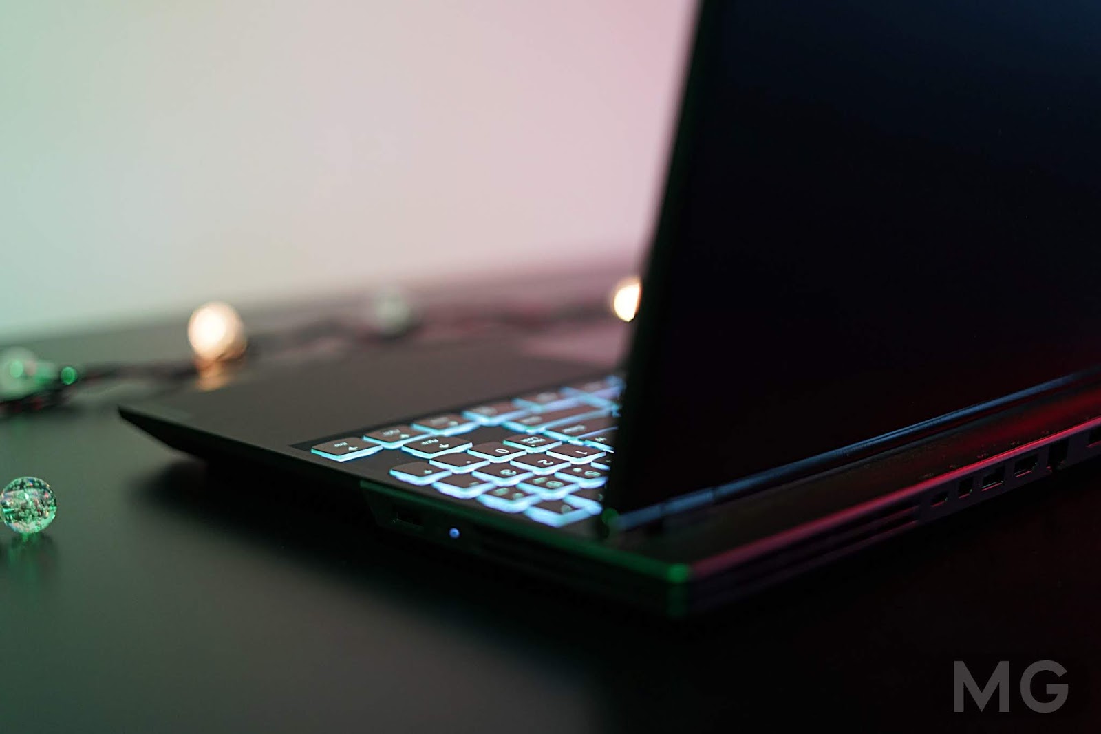 또 백라이트도 눈길이 가는데요. 키캡 아래에서만 빛이 들어오는 게 아니라 모서리 끝에 하얗게 빛이 맺힙니다. 게이밍 노트북치고 색다른 색상 조합이기도 하고, 디자인 자체도 세련된 것 같네요.