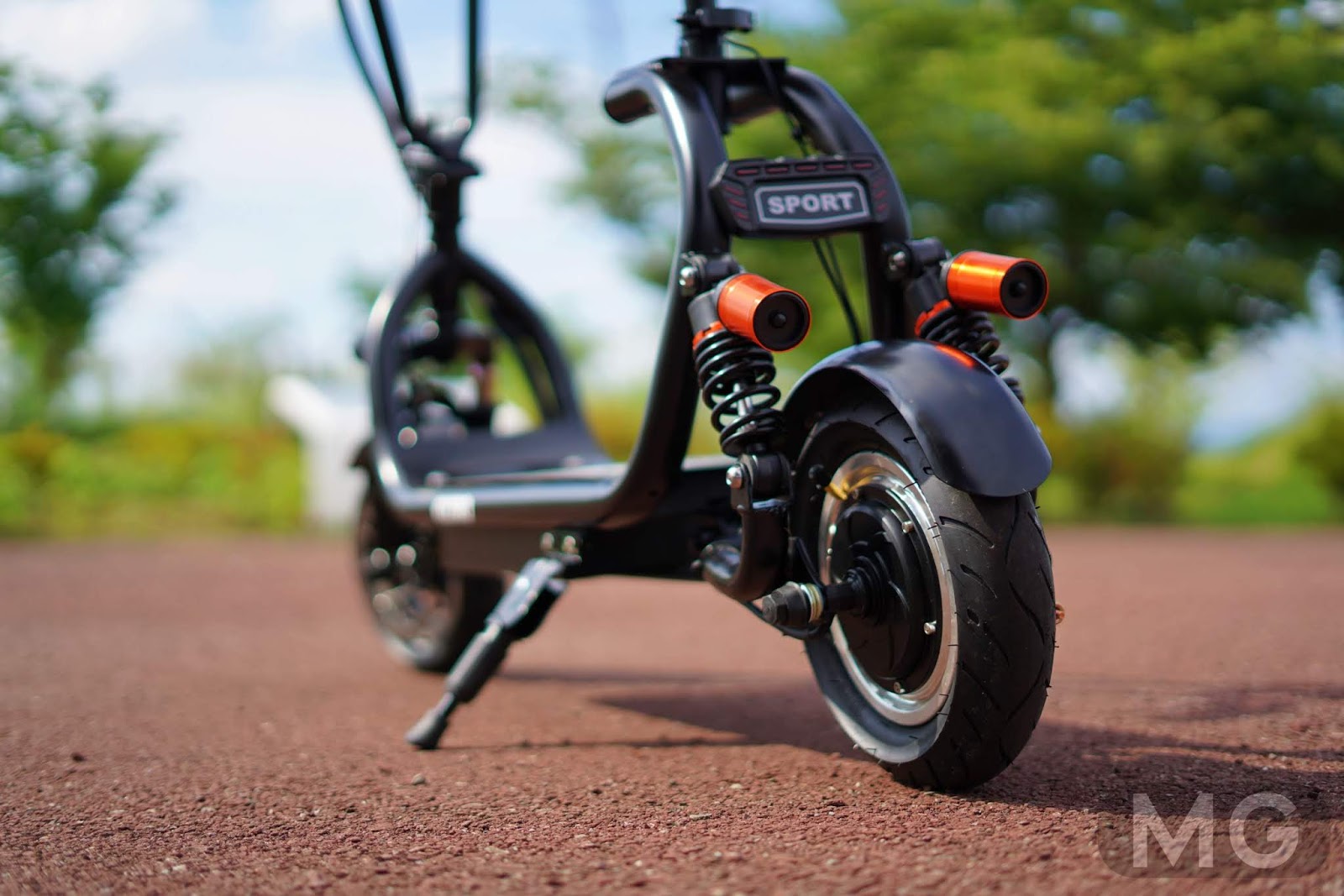 쿼드 서스펜션을 품은 S50 전동 바이크는 전후방 모두 충격을 크게 줄여주더라고요. 거기다 와이드 데크로 발 쪽에 공간도 넓어서 가벼운 물건이나 가방을 올려둘 수도 있었는데요.