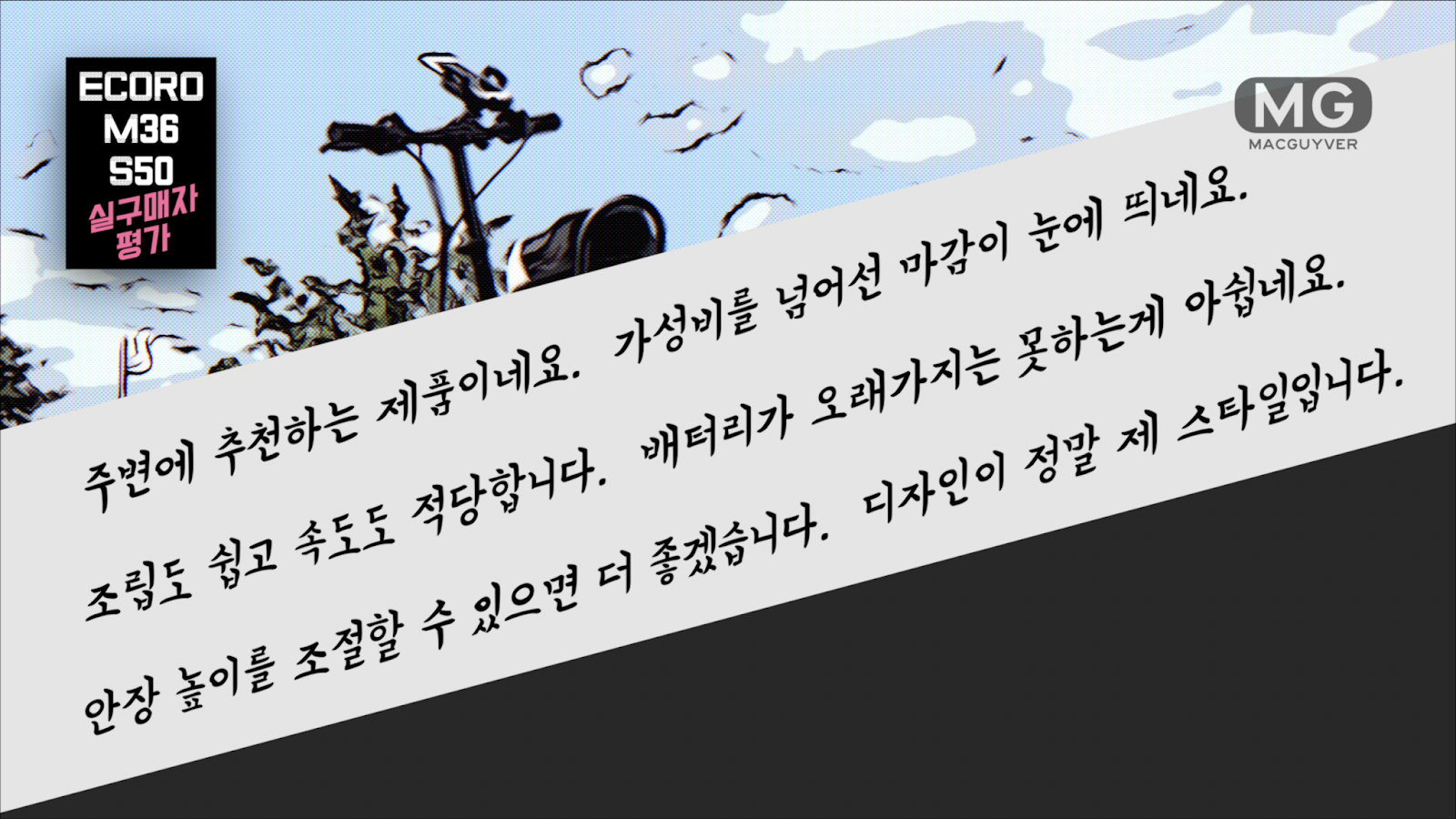 저는 두 제품 다 나름의 장점과 차별점이 눈에 띄었는데요. 두 가지 전동 스쿠터 추천 제품에 대한 여러분의 생각이나 의견이 있으시다면 댓글을 남겨주시기 바랍니다. - MACGUYVER.