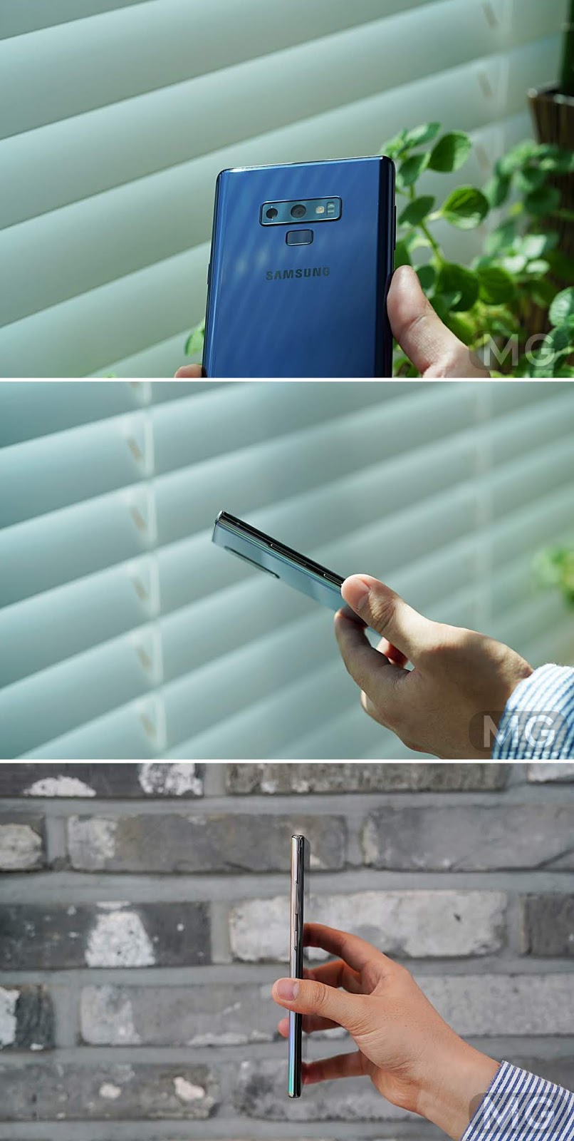 노트9은 측면이 살짝 각진 느낌이고, 전후면이 거의 같은 대칭형으로 전체적으로 각진 듯 매끄러운 손맛이 단단해서 좋더라고요.