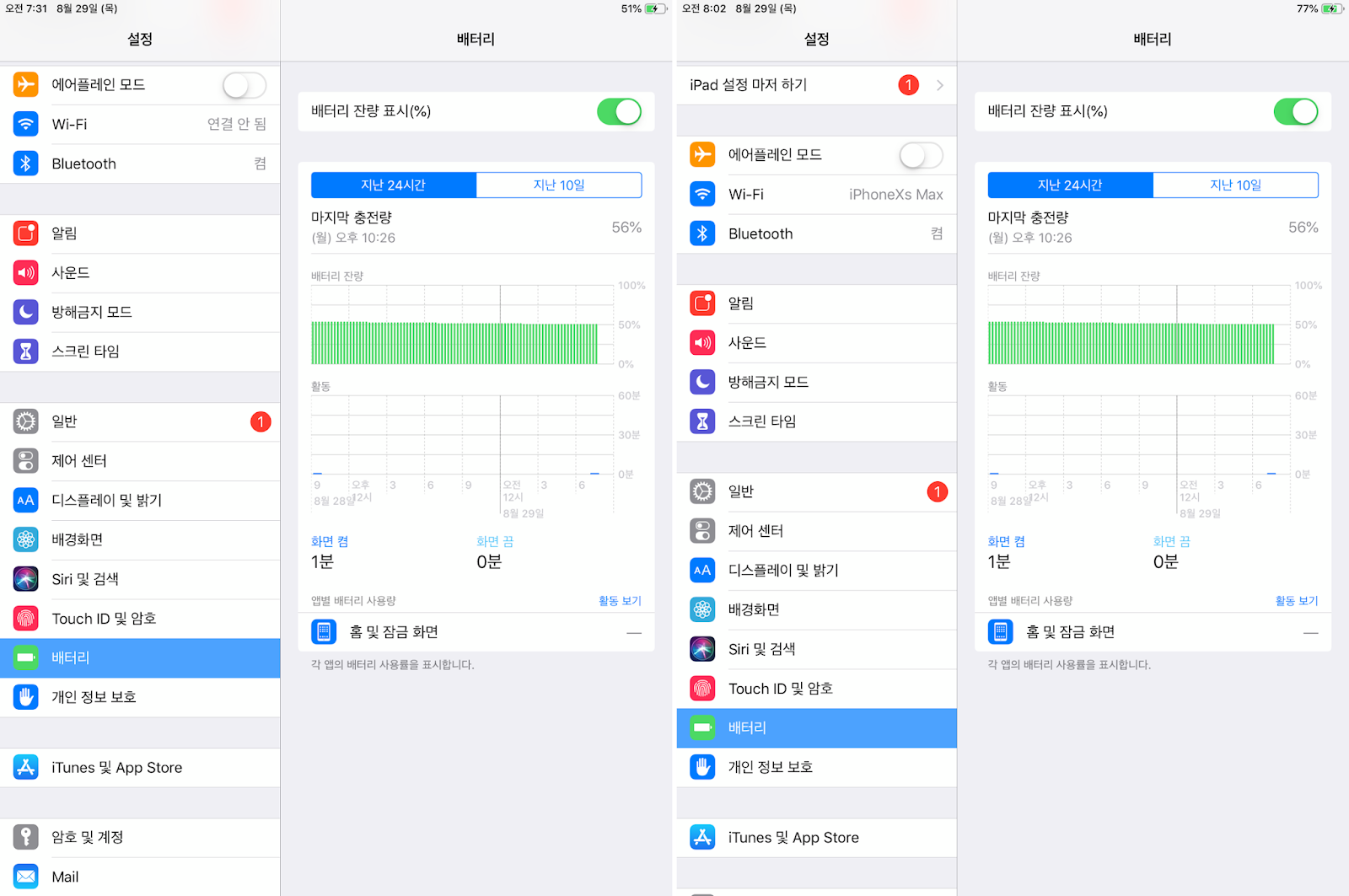 아이패드 미니 5세대를 가진 지인에게 케이안 아이폰 고속 충전 케이블로 충전을 부탁을 해보니까, 30분 동안 배터리가 51%에서 77%까지 충전되었다고 했습니다.