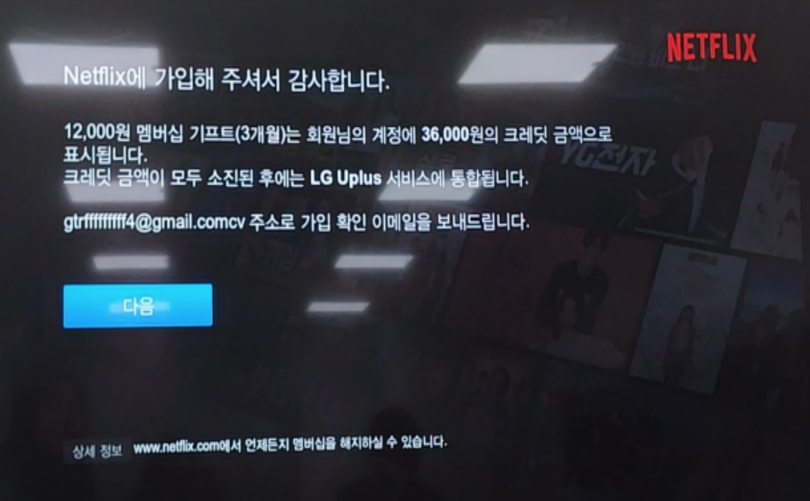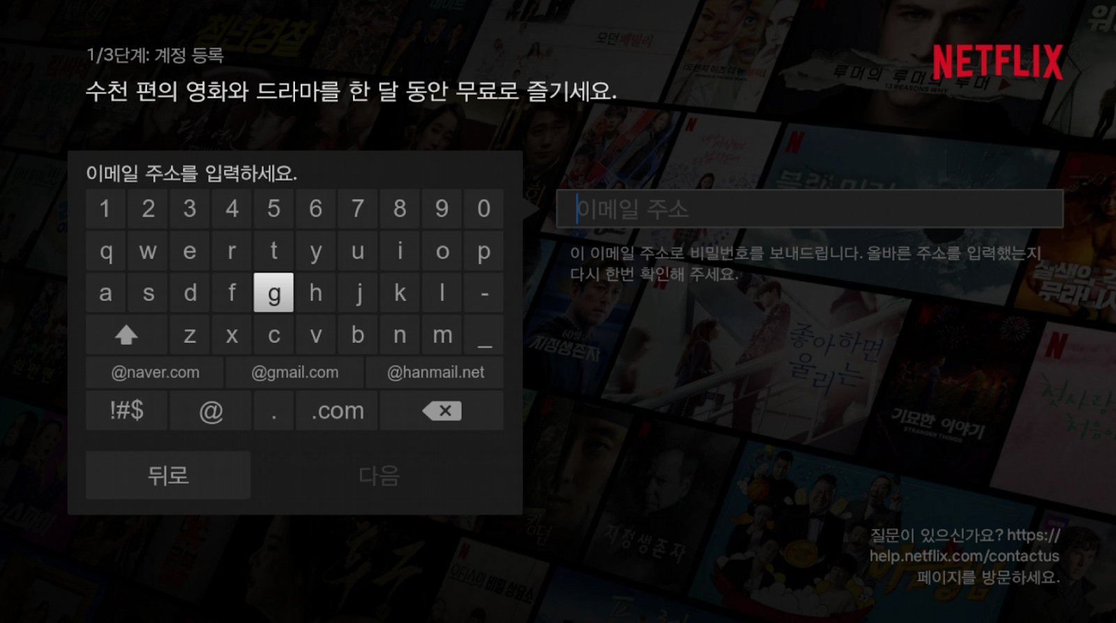 이번에는 넷플릭스에 사용할 이메일 주소를 입력 후 다음 버튼을 눌러줍니다.