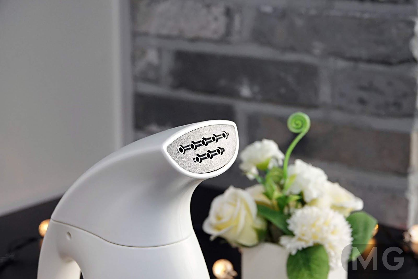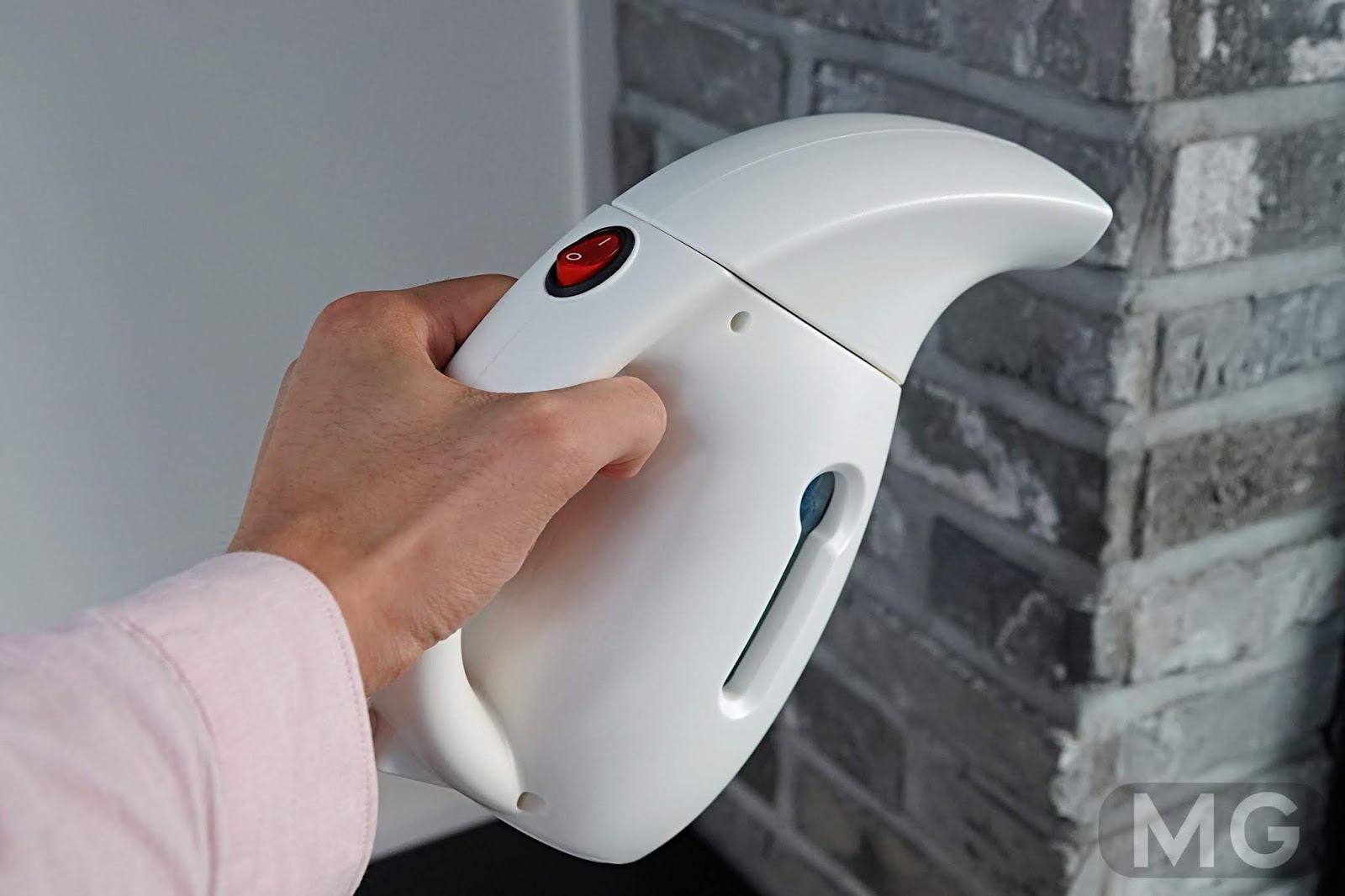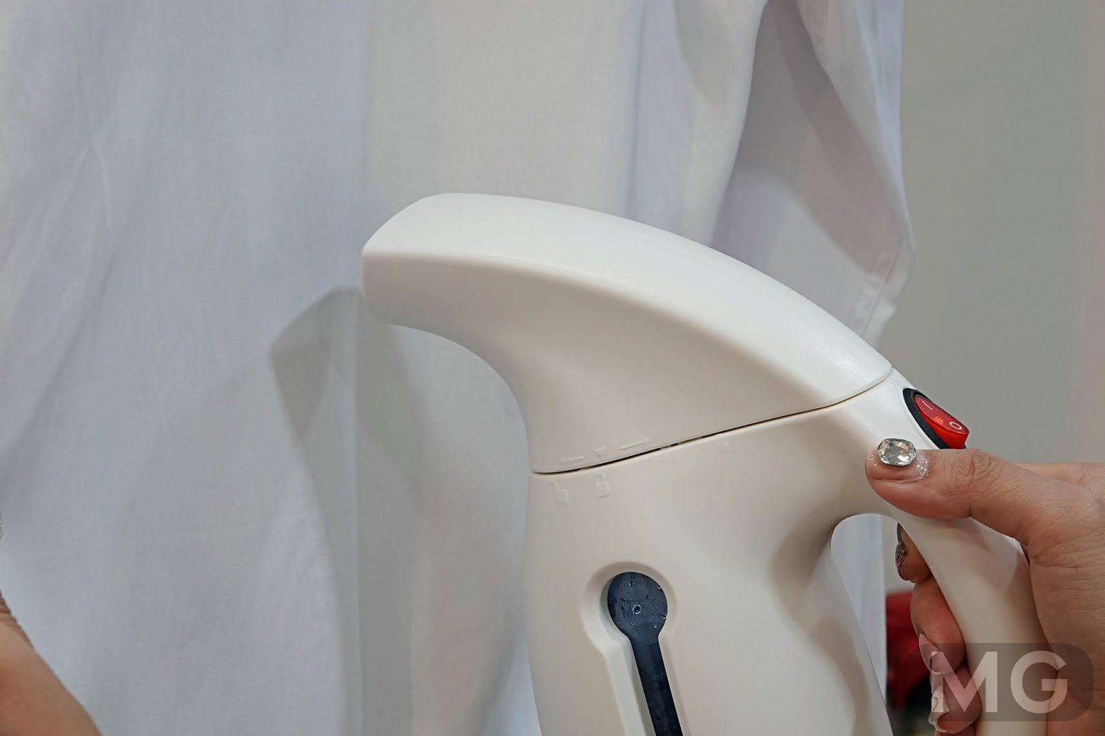 전원 스위치가 손잡이 윗부분에 위치하고 있고, 핸들 부분은 인체공학적으로 제작되어 사용하기 편안하며 그립감도 상당히 좋았습니다. 손으로 스팀다리미를 쥐었을 때 너무 크지도 작지도 않아 편안함을 주더라고요.
