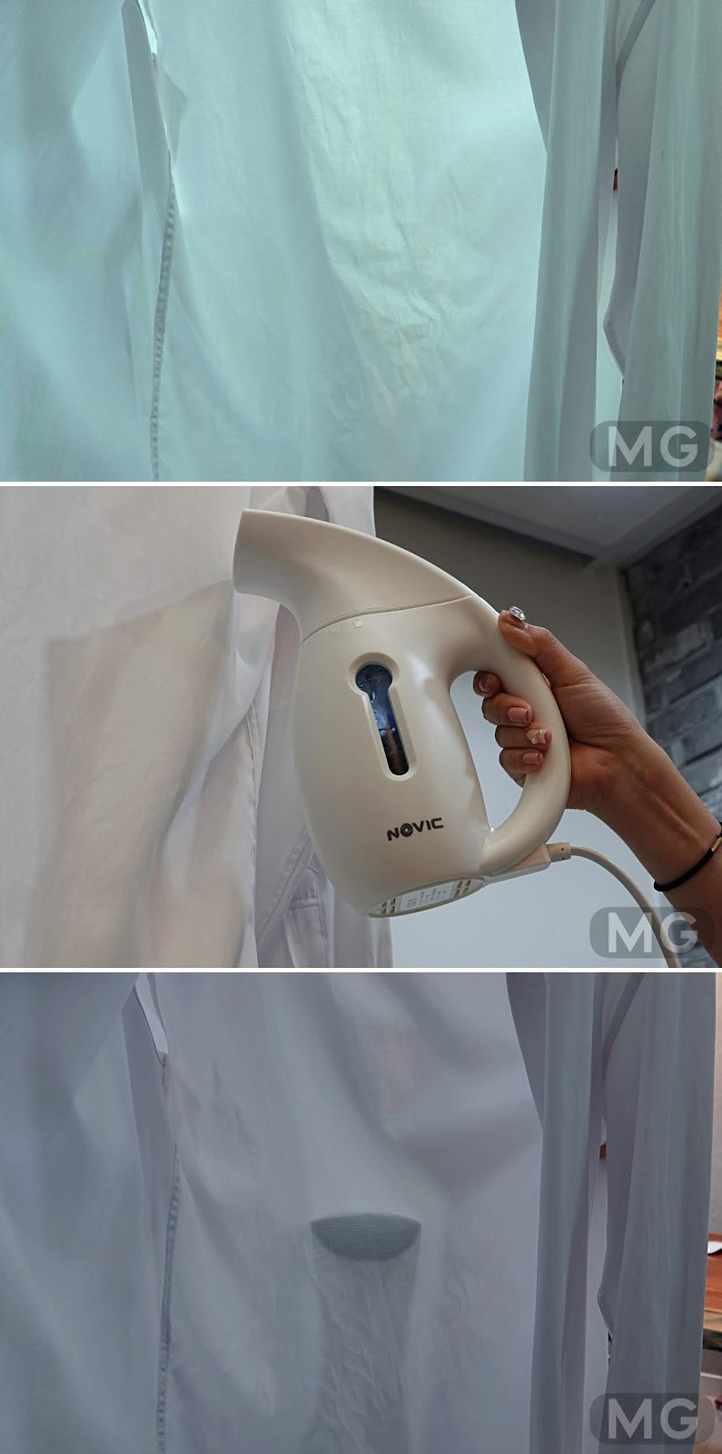 또한 노빅 스팀다리미는 따로 다리미판이 필요 없었는데요. 옷걸이에 걸려있는 채로 바로 다릴 수 있는 디자인이기 때문이죠.