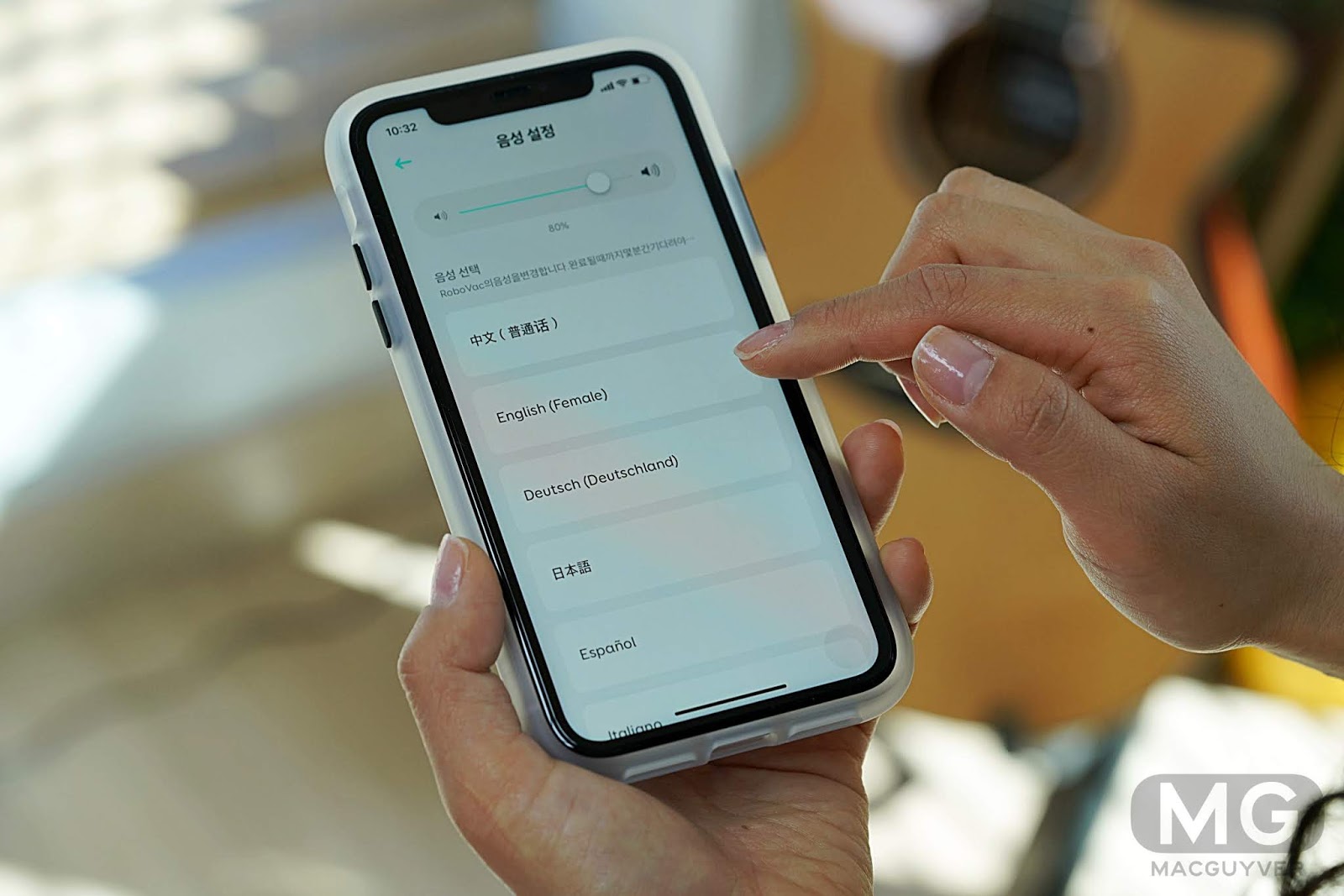 음성 안내를 한국어로 변경할 수 있습니다. 특히 마음에 드는 점은 음량 조절이 가능하다는 점입니다. 센스있네요. 다만 한국어를 잘 알지는 못하는 것 같습니다. 청소가 끝났는데 충전이 끝났다고 말하더라고요.