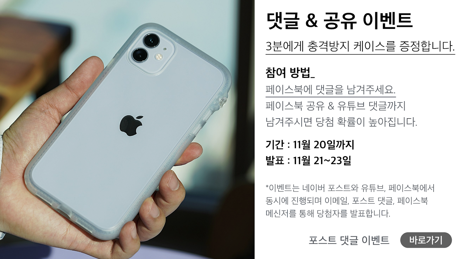 마지막으로, 3분에게 아이폰11 카탈리스트 케이스를 증정해드리는 댓글 이벤트 힌트를 드리자면 이 제품에 기대되는 점 2가지와 함께 댓글을 남겨주시면 됩니다.