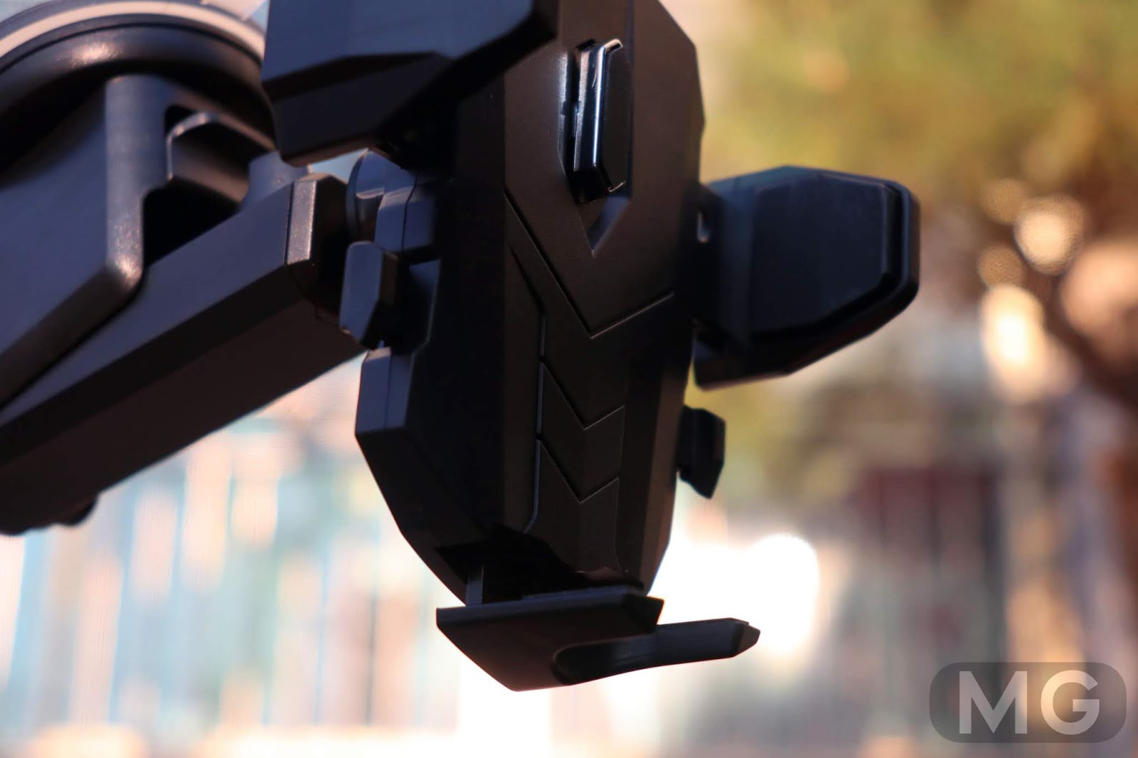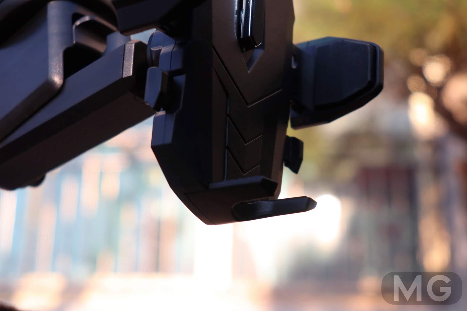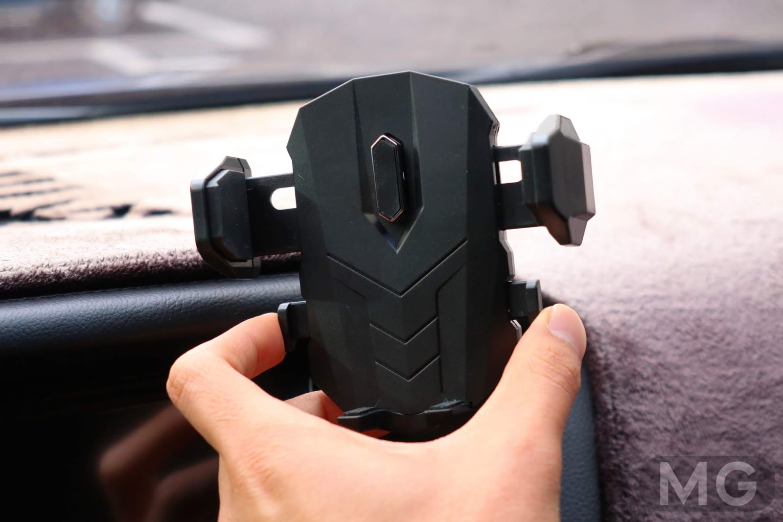 우선 메인 거치대를 보면, 버튼이라고 해야 하나요, 양쪽에 튀어나온 무언가를 눌러서 거치대의 팔을 벌려줄 수 있습니다.