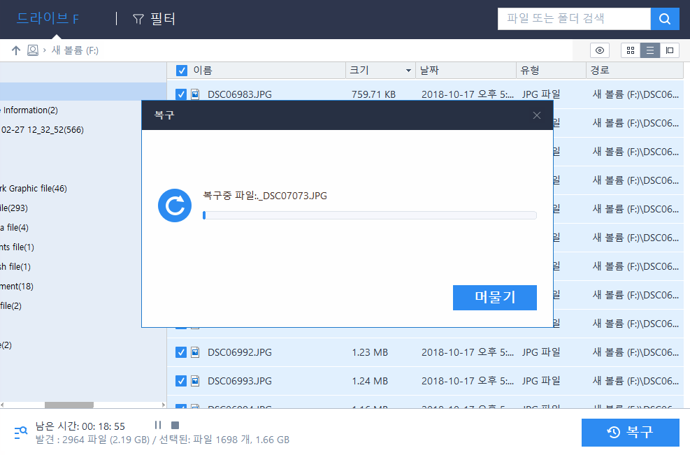 - 손실된 데이터 검색을 파일 유형 및 이름, 시간별로 빠르게 필터링 가능