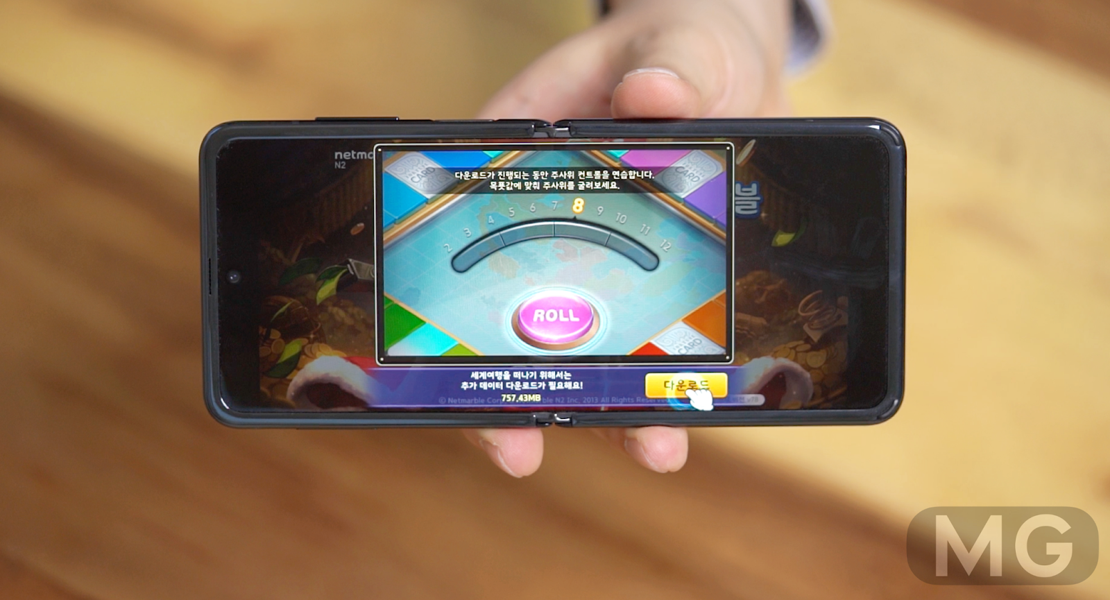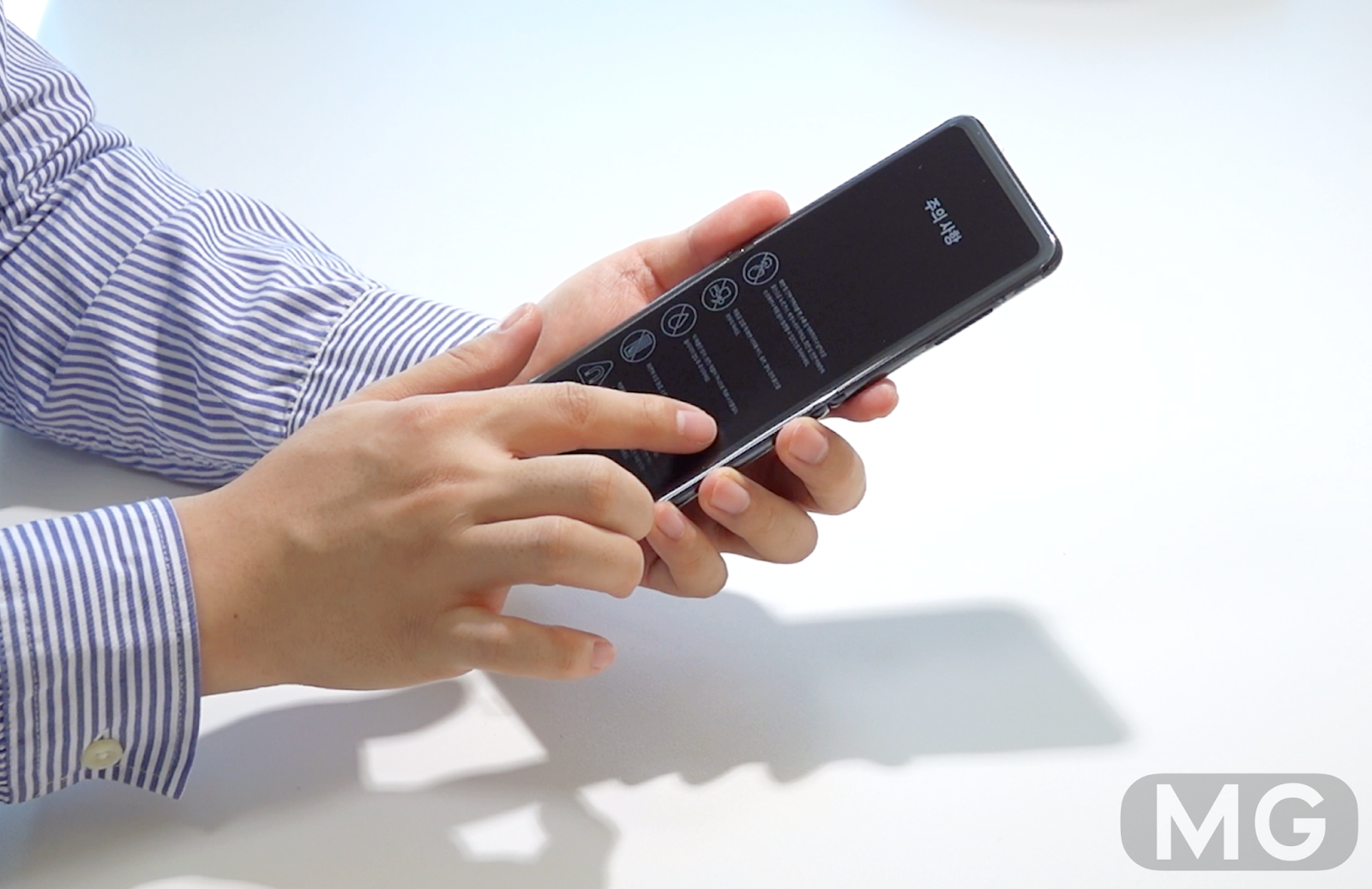 #27. 반대로 뒤집어서, 그러니까 누워서 폰을 위로 들어도 접히지 않고 일자로 평평합니다. 폴드랑 다른 부분이네요.