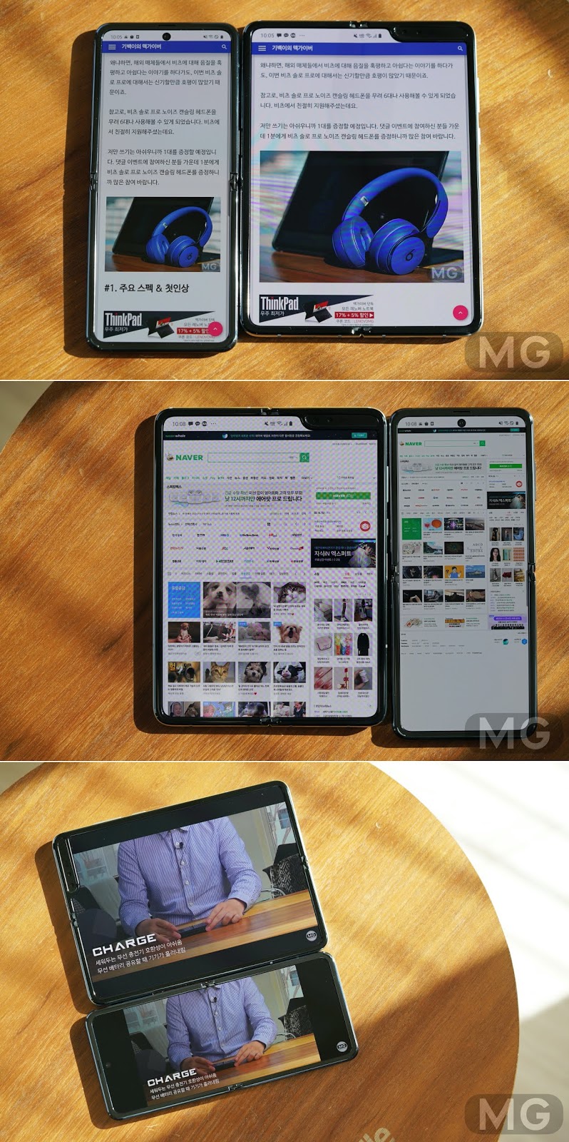 #60. 갤럭시 Z 플립을 아래에 두고 무선 배터리 공유할 때 기기가 흘러내립니다. 조절을 잘해야겠네요.