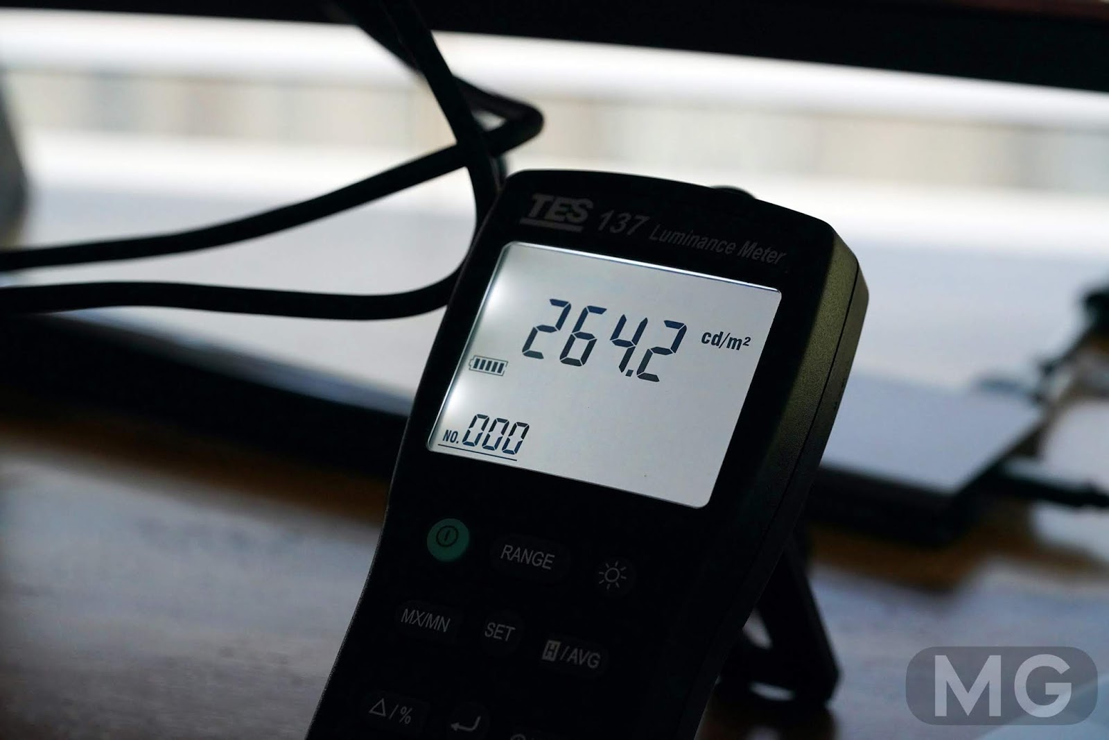 추가적으로, 니트 측정기로 직접 블랙과 화이트 화면을 측정해본 결과, 블랙에서는 놀랍게도 ‘0’이 나왔고, 화이트 화면에서는 264.2니트가 나왔는데요.