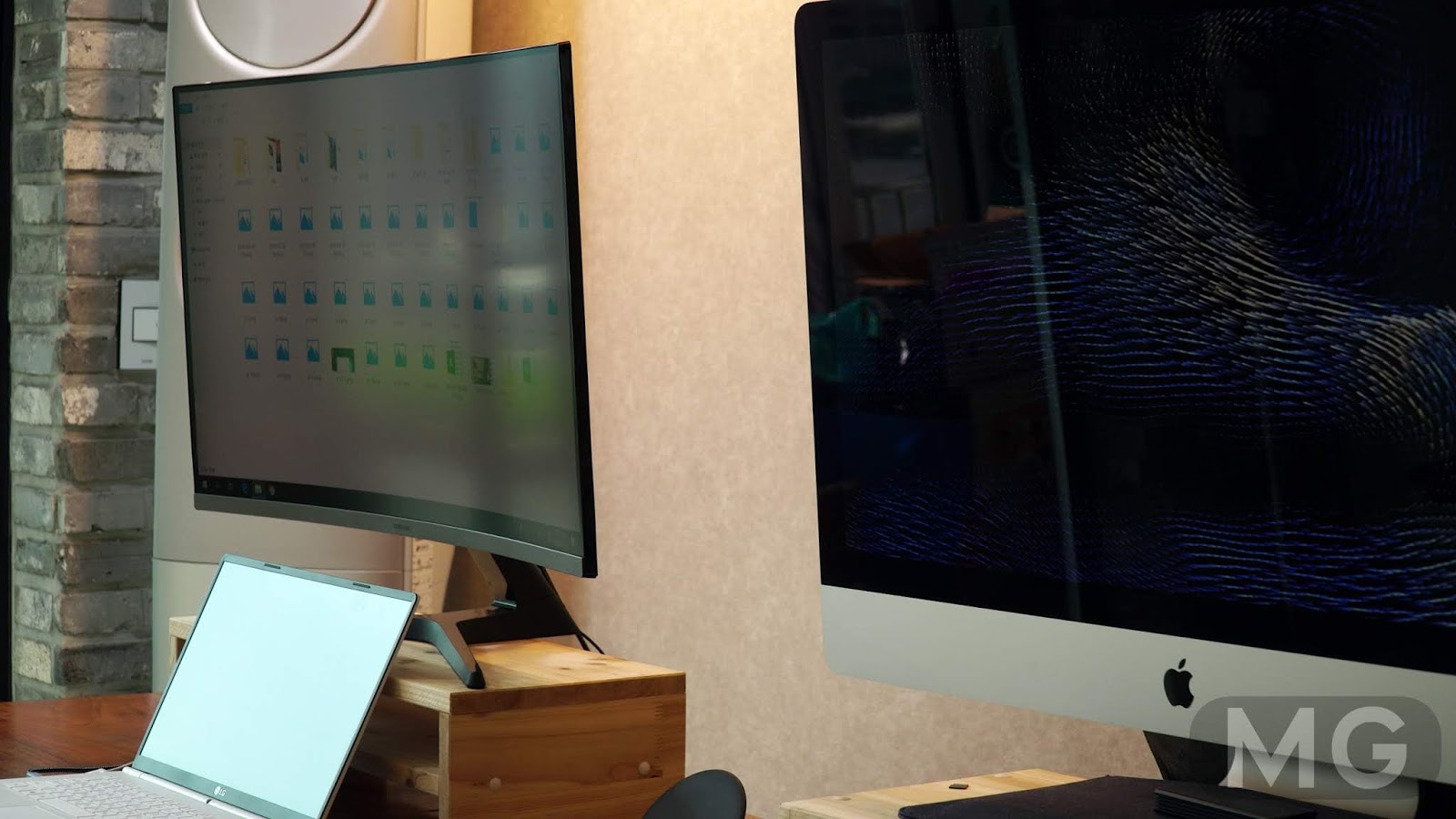 우선 사무용 모니터의 관점에서 보자면 평면 대비 곡면형 디자인으로 눈에서 멀어지는 거리가 거의 같아서 오는 장점이 있었습니다.