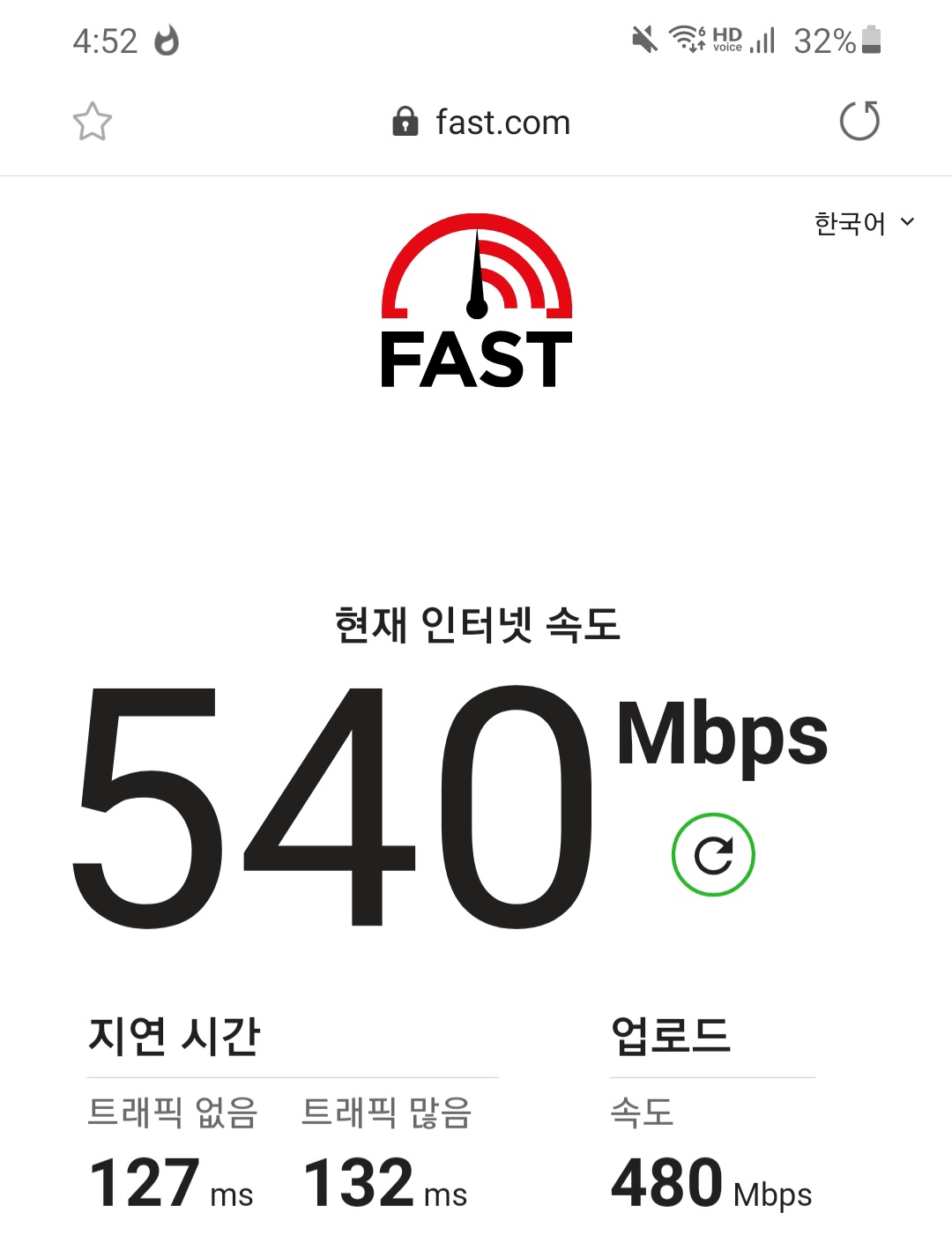 갤럭시S20 울트라 단독 측정시에는 540Mbps가 나왔고, 업로드도 480Mbps가 나와서 정말 시원시원했는데요.