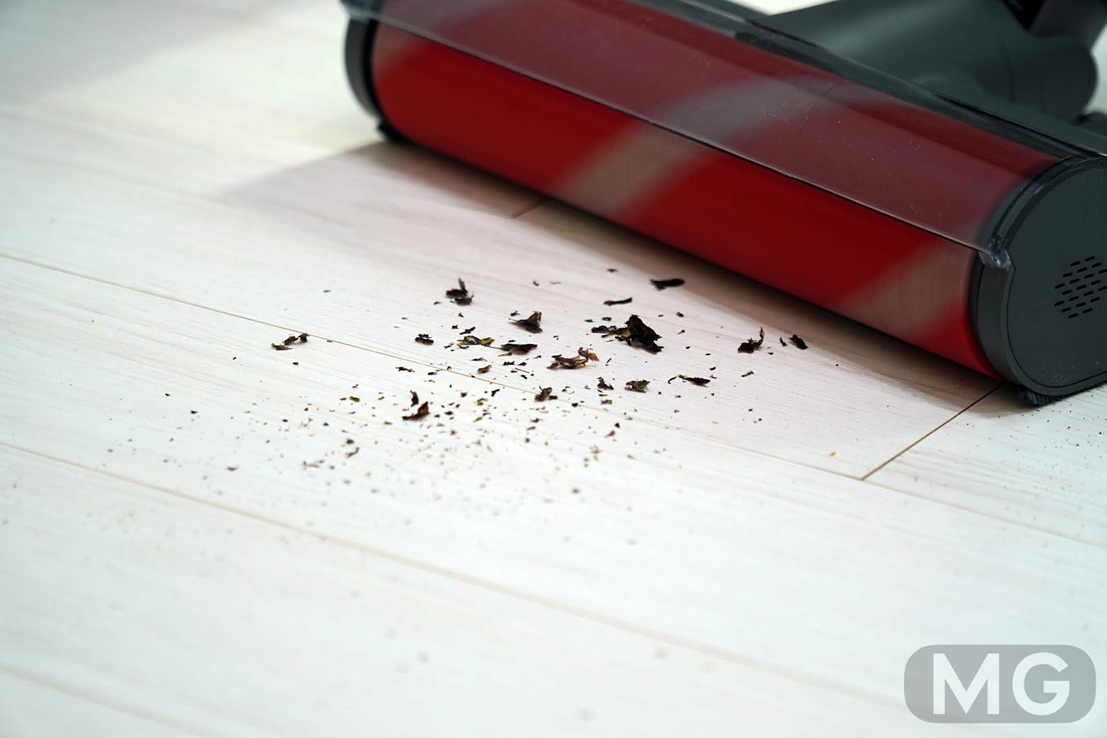바닥청소용 브러시는 1100RPM으로 강력하게 회전하며 마룻바닥에서 효과적으로 먼지를 쓸어 담아 주었습니다.