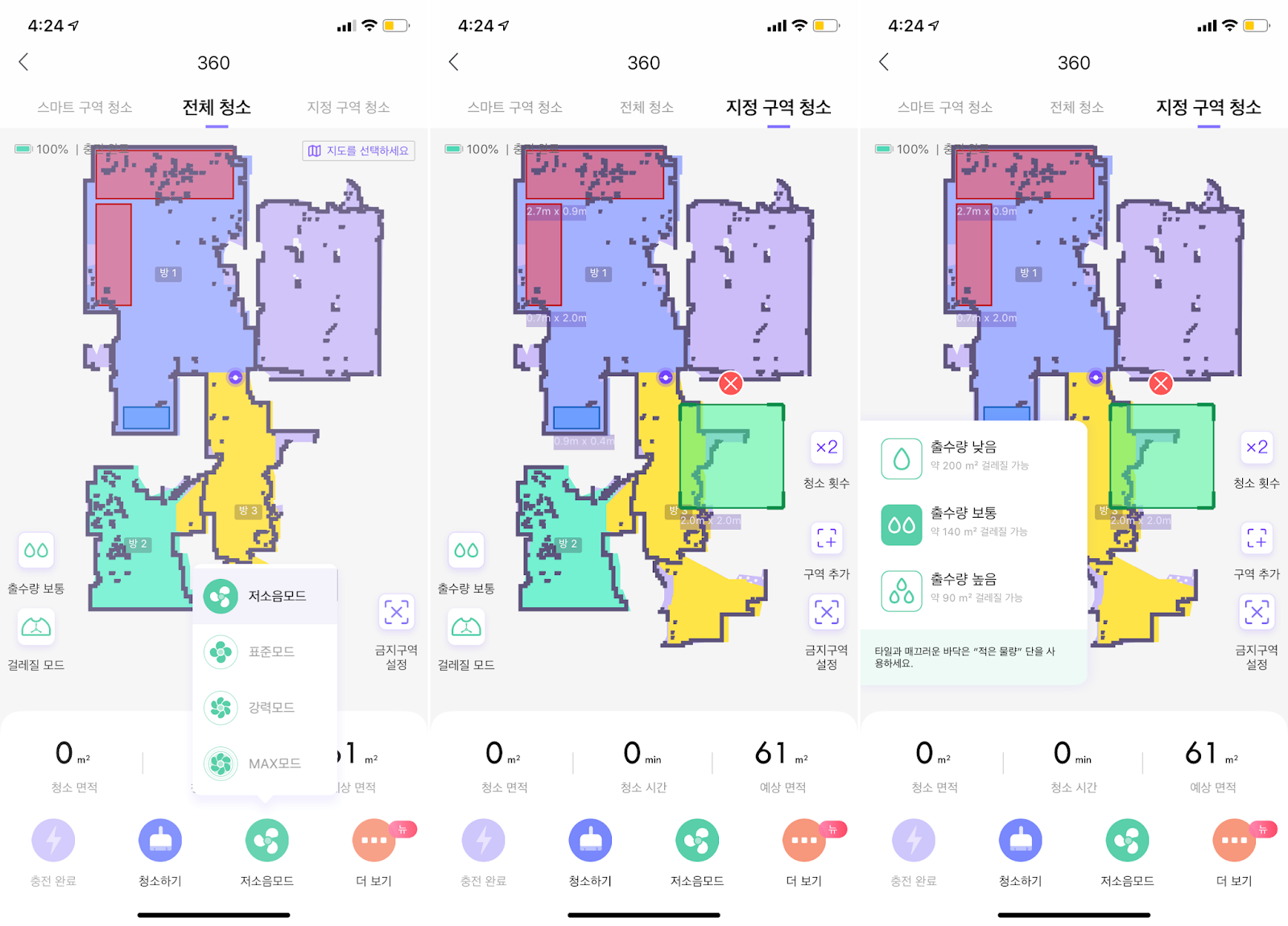 아마도 흡입력을 낮추고 물걸레 청소까지 3단계 물 배출량 조절하면서 구동되느라 그런 것 같네요.