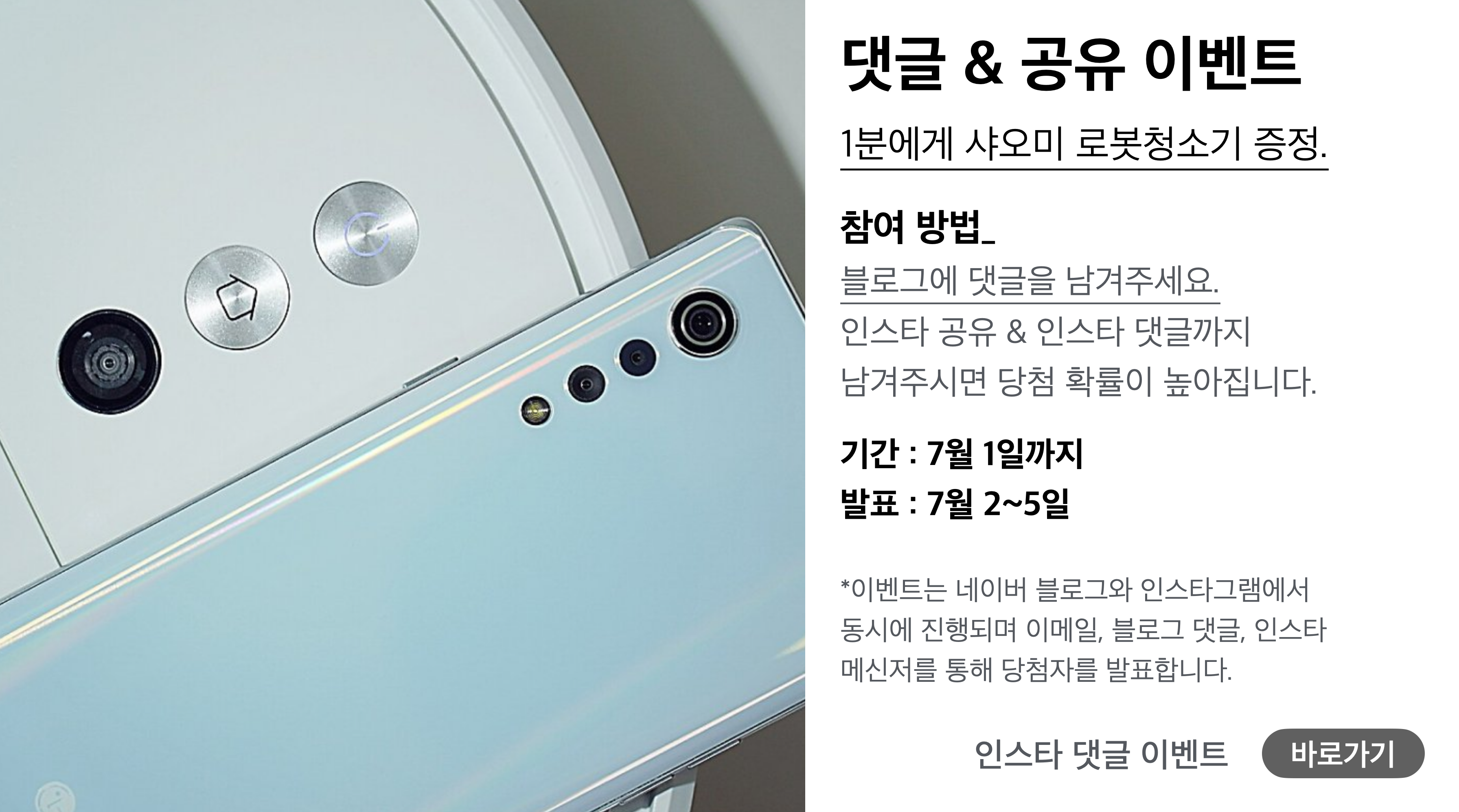 이번 리뷰 역시 증정과 함께 진행되는데요. 샤오미 드리미 F9 로봇청소기를 1분에게 증정해드릴 예정으로 네이버 블로그와 인스타그램에서 동시 참여가 가능합니다.