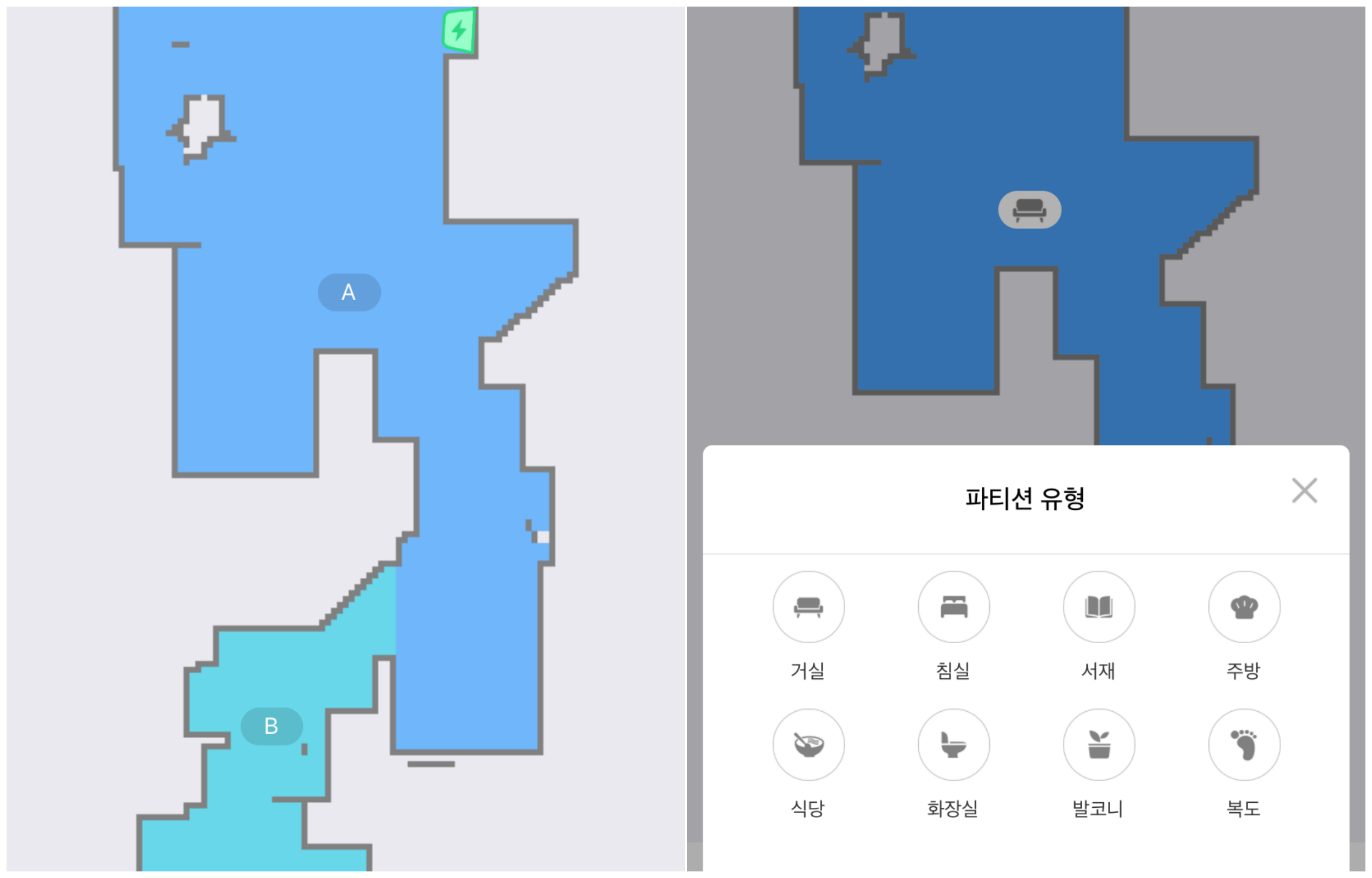 또한 방을 지능적으로 파악해서 거실과 분리된 공간으로 인지하더라고요. 하지만 사용자가 임의로 방을 지정하거나 영역을 만드는 건 안됩니다.
