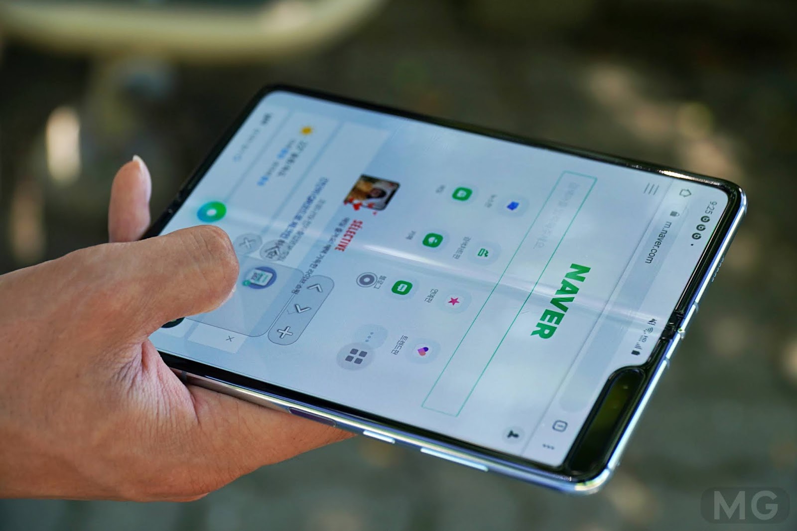 한손 사용이 불가능할 줄 알았던 갤럭시 폴드의 쫙 펴진 화면은 은근 가볍습니다. 오른손으로 잡고 있으면 무게감이 생각보다 훨씬 안정적이거든요.