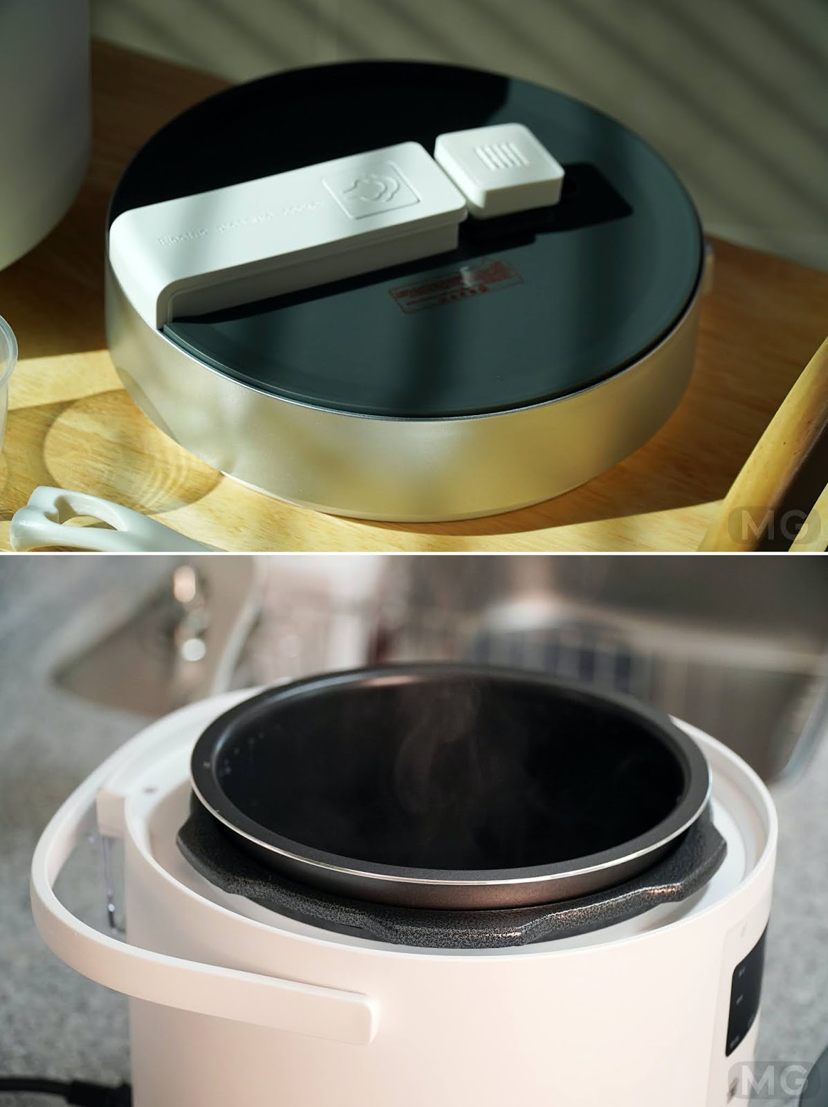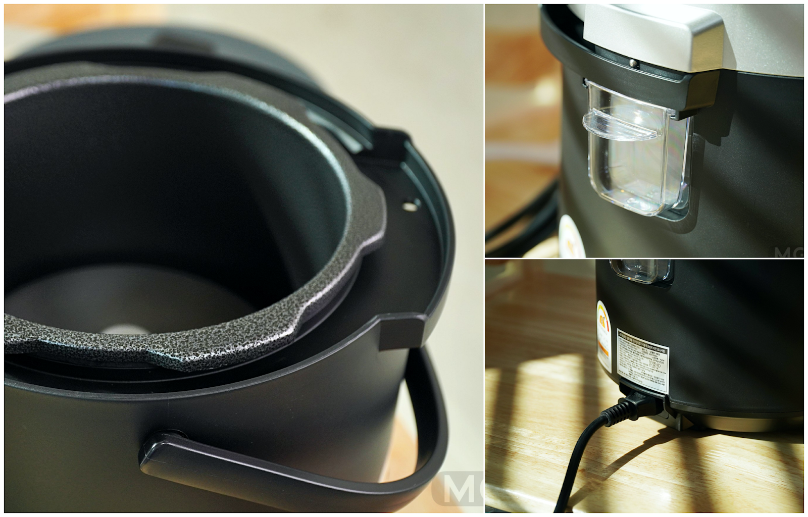 보통 밥솥은 뚜껑이 고정되어 열고 닫는 방식이라면, 이 제품은 뚜껑이 완전 분리가 된다는 거죠.