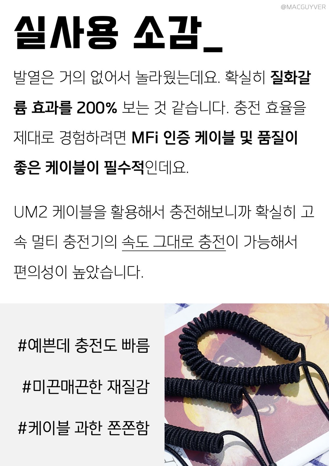 UM2 맥북 충전기 실사용 소감_ 발열은 거의 없어서 놀라웠는데요. 확실히 질화갈륨 효과를 200% 보는 것 같습니다. 아이폰 고속 충전기의 충전 효율을 제대로 경험하려면 MFi 인증 케이블 및 품질이 좋은 케이블이 필수적인데요. UM2 케이블을 활용해서 충전해보니까 확실히 고속 멀티 노트북 충전기의 속도 그대로 충전이 가능해서 편의성이 높았습니다.
