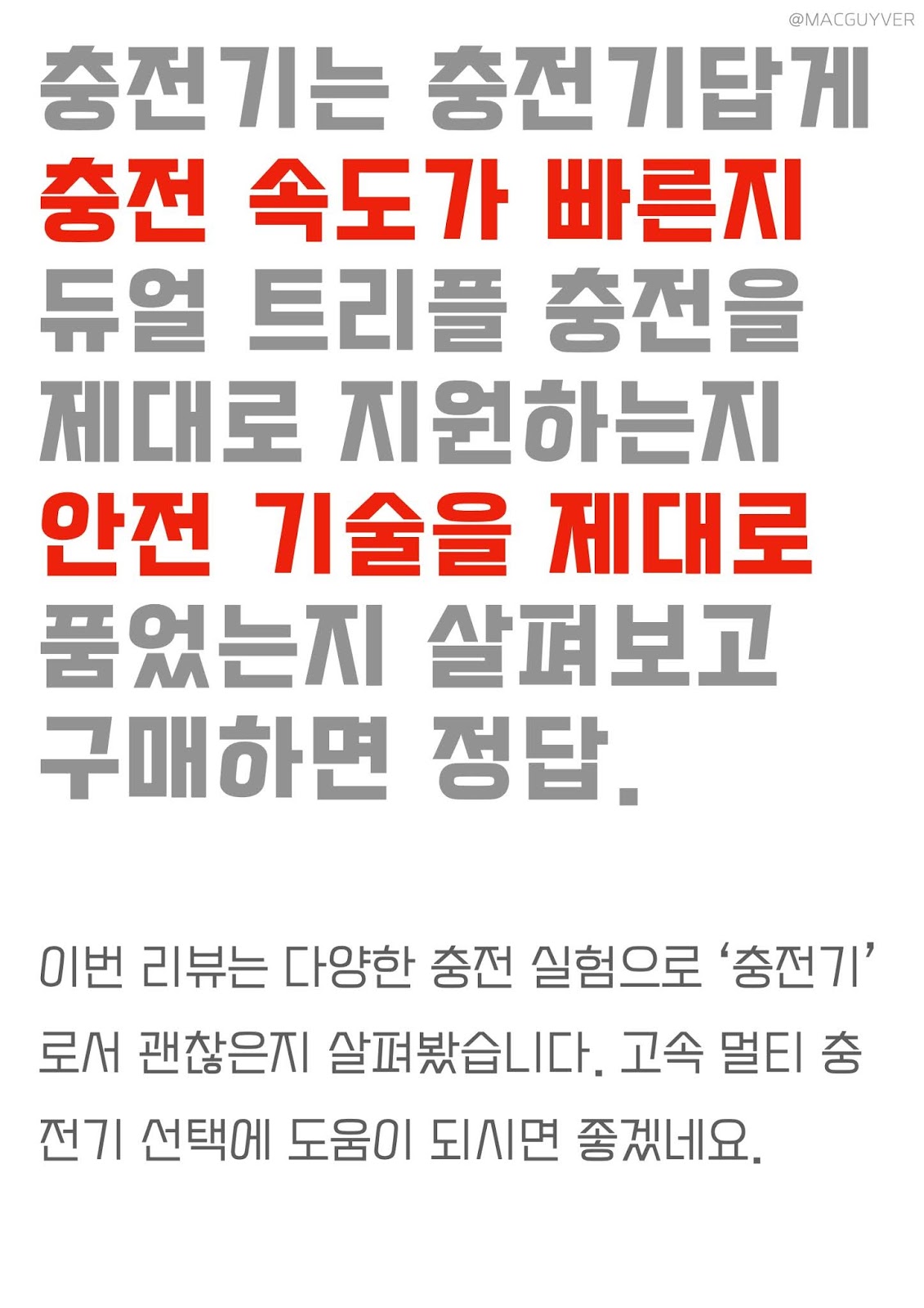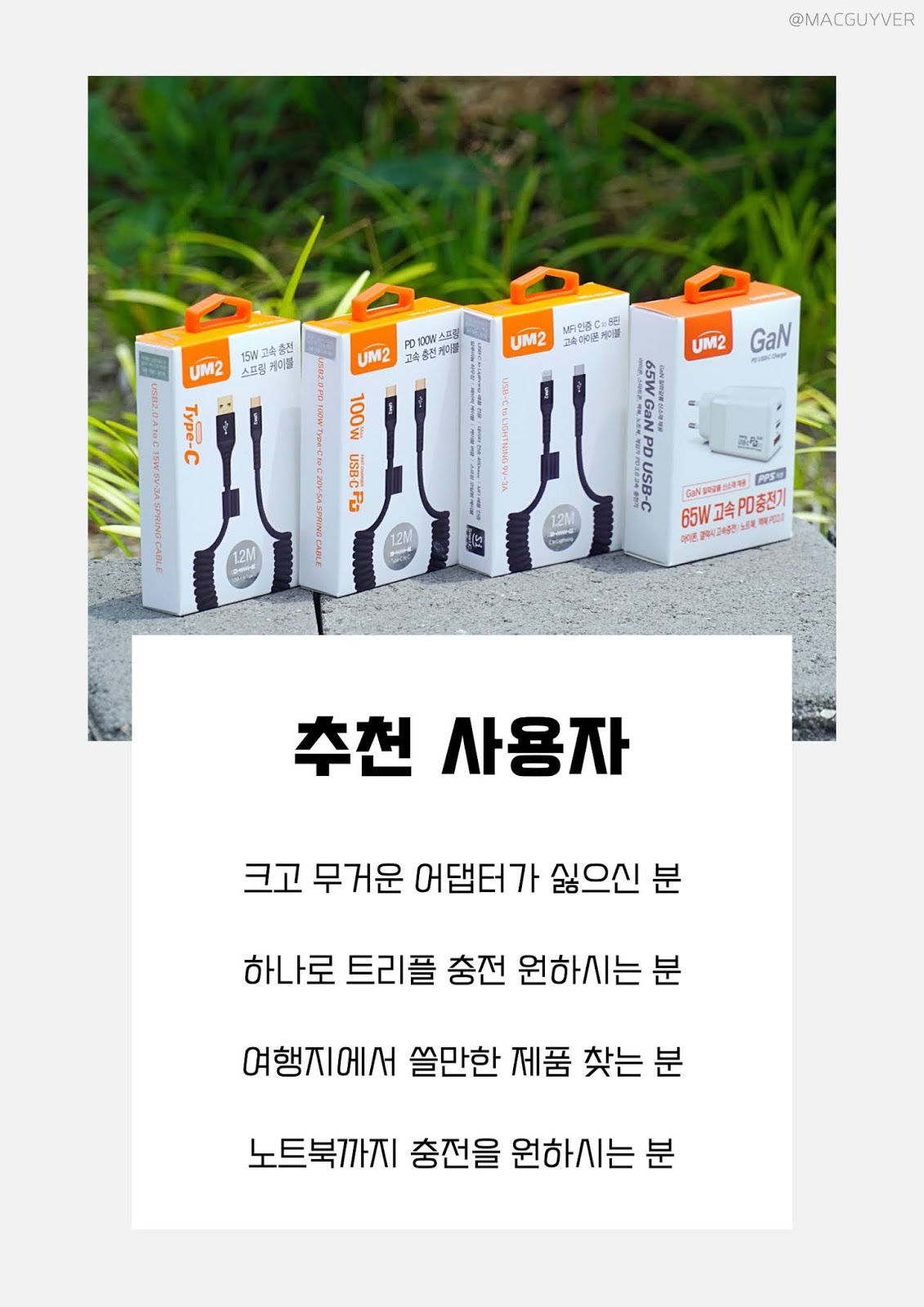 노트북 충전기는 충전기답게 충전 속도가 빠른지 듀얼 트리플 충전을 제대로 지원하는지 안전 기술을 제대로 품었는지 살펴보고 구매하면 정답. 이번 리뷰는 GaN 충전기의 다양한 충전 실험으로 ‘충전기’로서 괜찮은지 살펴봤습니다. 고속 멀티 충전기 선택에 도움이 되시면 좋겠네요. UM2 맥북 충전기는 크고 무거운 어댑터가 싫으신 분 하나로 트리플 충전 원하시는 분 여행지에서 쓸만한 제품 찾는 분 노트북까지 충전을 원하시는 분-MACGUYVER.